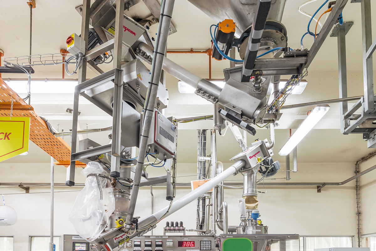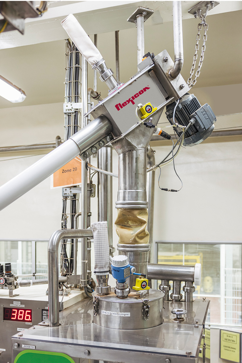 He learned that the operation would improve if the powder could free fall into the metal detector in a steady stream. One possible solution would be to add a rotary valve under the surge hopper, but lack of headspace made that impossible, Phua says. Instead, Flexicon recommended offsetting and raising the metal detector, allowing room to add a new flexible screw conveyor to feed powder to the metal detector in a steady, controlled flow. Flexicon Singapore provided the new conveyor to accommodate spatial constraints and throughput requirements.
