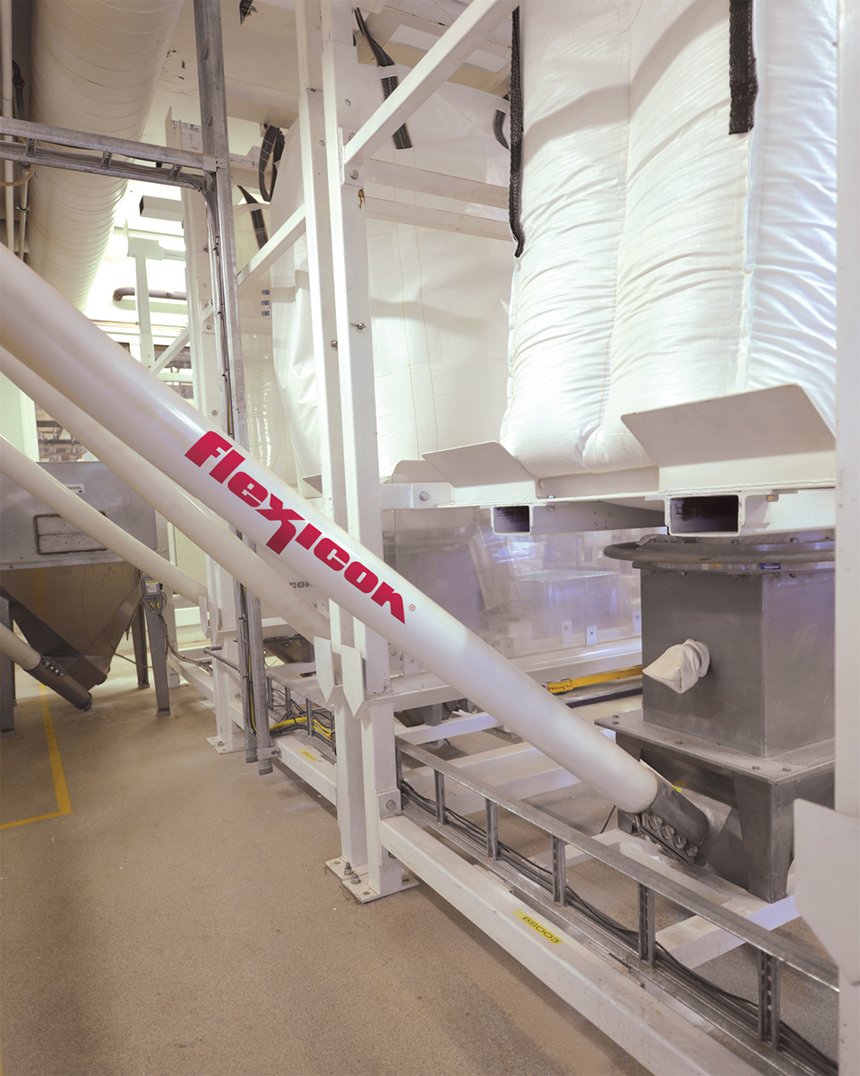 Where gravity feeding of materials is not possible, the plant transfers bulk materials using bulk bag dischargers, flexible screw conveyors, rigid augers and pneumatic conveyors — equipment that reduces manual labour, contains dust, and fits in very tight spaces, as recently demonstrated with the addition of a twin half-frame bulk bag discharger.