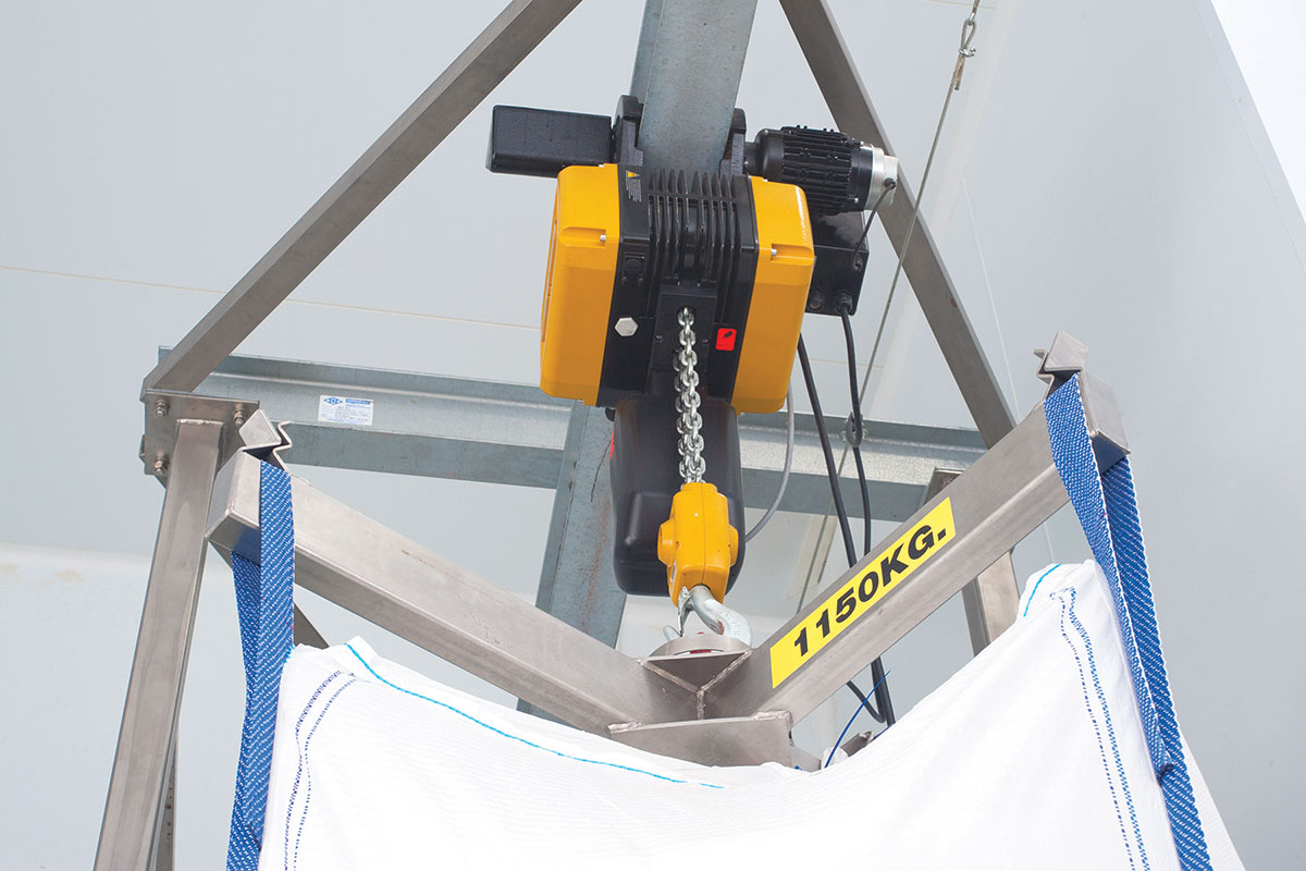 One tonne bulk bags are positioned alongside a Flexicon BULK-OUT® BFC-S-X stainless steel bulk bag discharger, which has an integral cantilevered I-beam with an electric hoist and trolley. The bag straps attach to a cross-shaped lifting frame, and the hoist lifts the bag into position on the discharger frame. An ATEX-rated earth clamp is then attached to the bag.