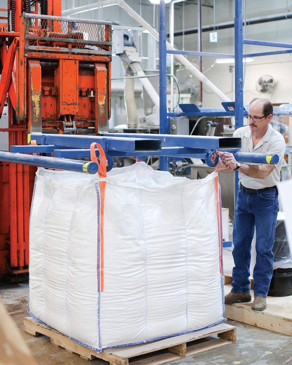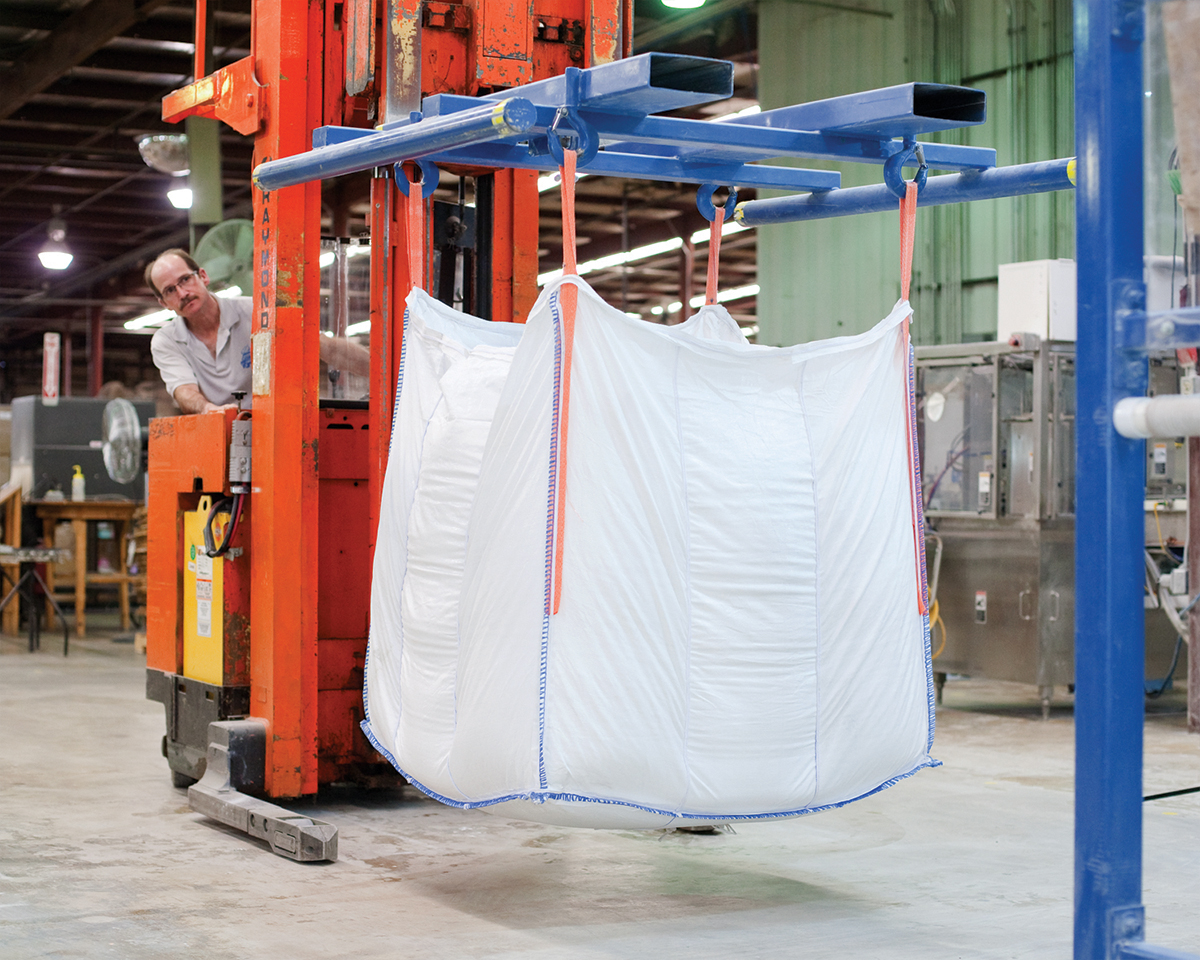 Raw talc now arrives at the plant in 2,000 lb (907 kg) bulk bags, the straps of which are attached to a bag lifting frame that is forklifted into cradle cups atop the 15 ft (4.6 m) high telescoping posts of the original Flexicon Model BFF Bulk Bag Unloader.