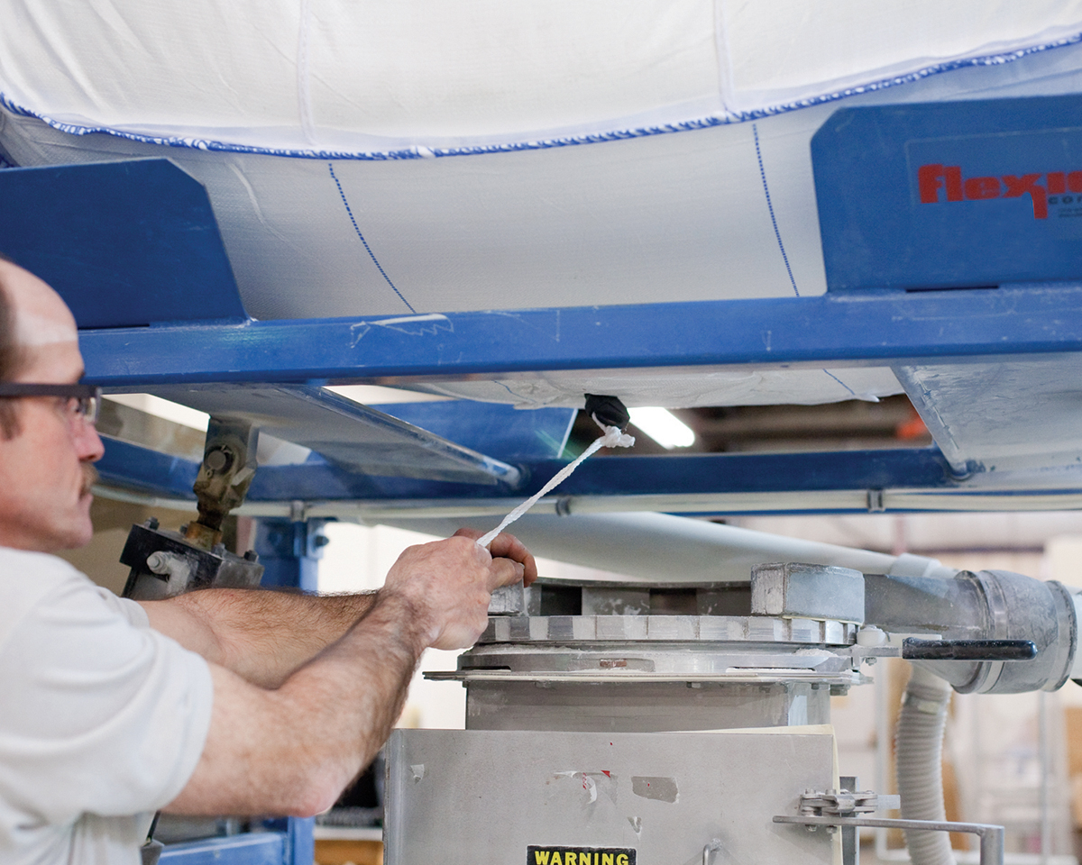 During the 8 to 12-hour continuous run cycle, the blender automatically discharges the blended batch into a 1 cu ft (0.028 cu m) surge hopper that charges the company’s original 15 ft (4.6 m) long flexible screw conveyor (previously used to unload bulk bags) which discharges into the surge hopper of the packaging machine.
