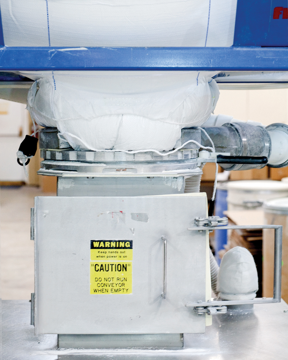 Previously, raw talc was shipped directly from the mine to a contract manufacturer where it was blended with glitter and fragrance, loaded into bulk bags and shipped. Once at Delagar, the pre-blended material was discharged by a bulk bag unloader into a 15 ft (4.5 m) long flexible screw conveyor that fed a packaging line.
