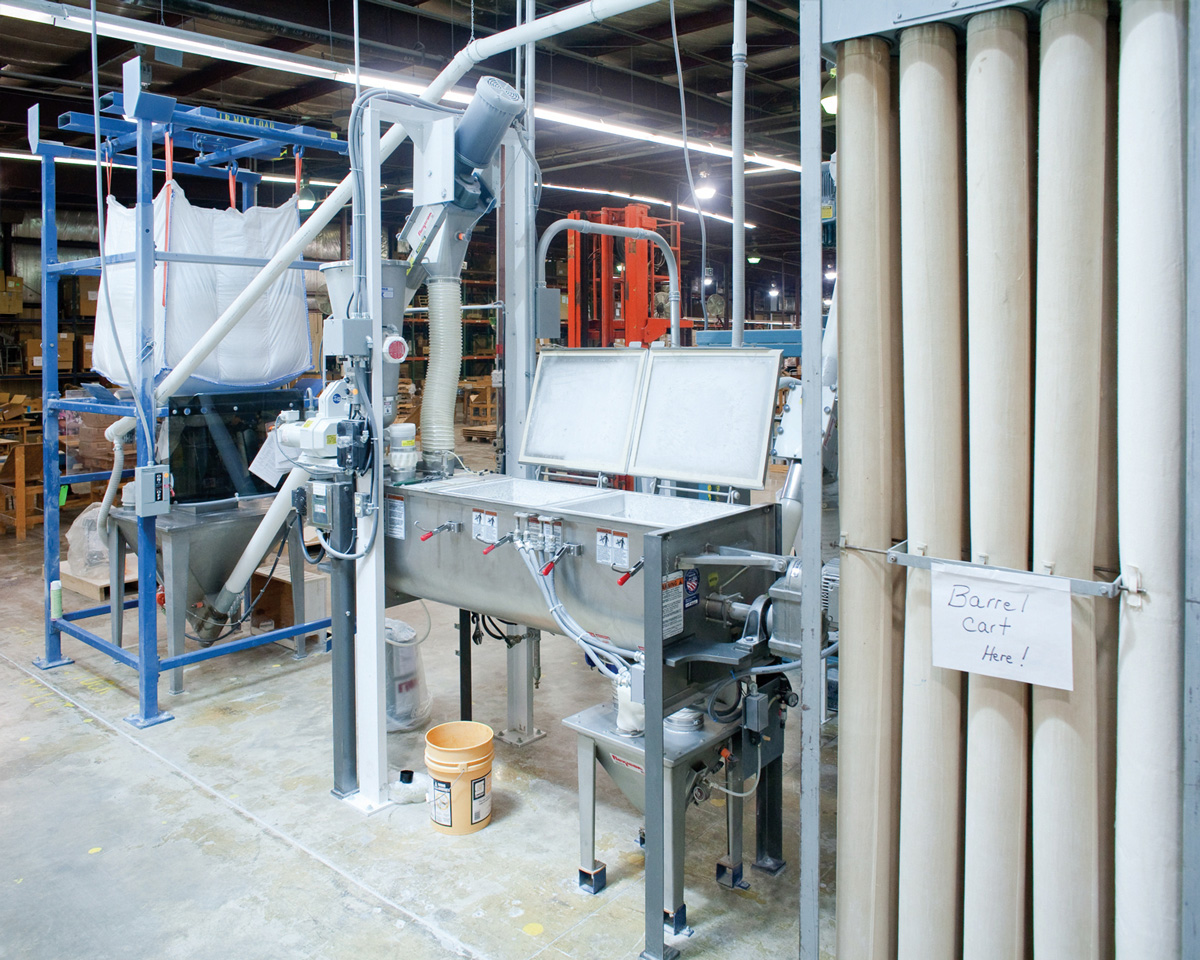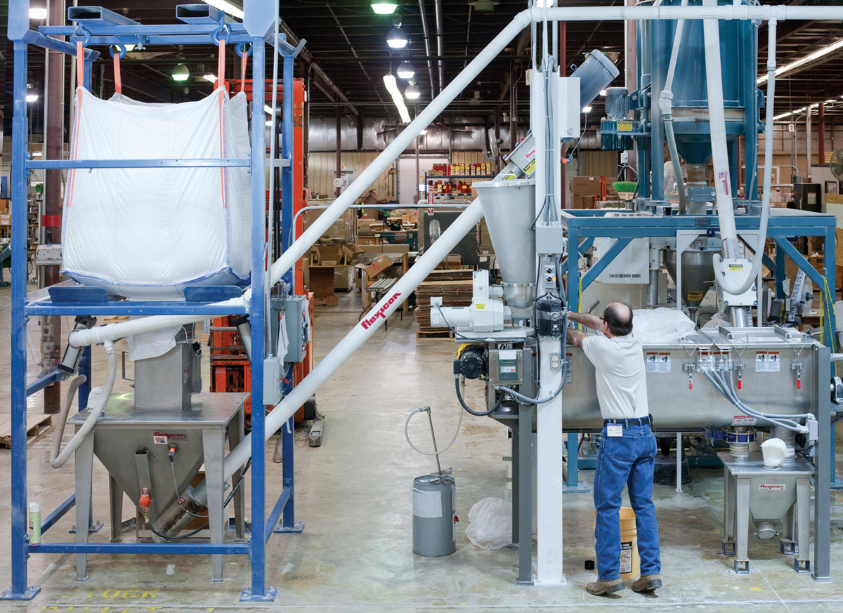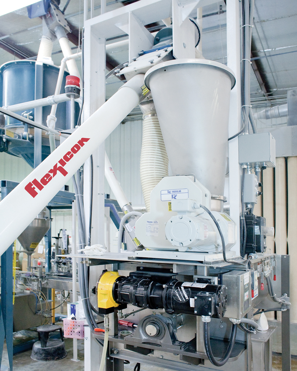 “Between production runs, an operator vacuums what little powder remains in the blender,” explains the production manager. The bottom end cap of the conveyors can be removed and the screws rotated in reverse to evacuate the tubes. “The flexible screw conveyors do not leave enough residue to concern us,” she says.