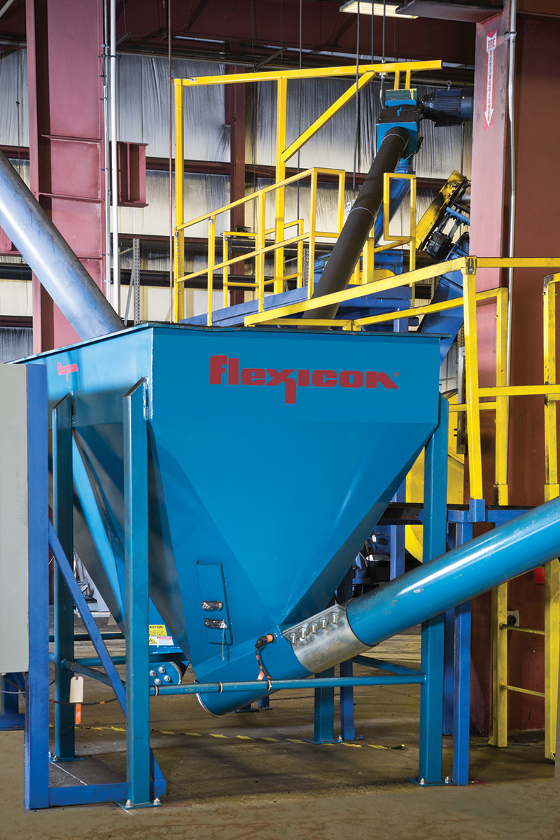 Moving the rubber particles from the bulk bags to the cracker mills are six automated BULK-OUT® BFC Bulk Bag discharger systems with integral flexible screw conveyors from Flexicon. An operator loads a bulk bag onto the discharger frame by electric hoist and trolley on a cantilevered I-beam; the discharger unloads the particles into a 20 cu ft (0.56 cu m) capacity floor hopper from which a 15 ft (4.57 m) long flexible screw conveyor transports them into one of six cracker mills. Kauffman explains, “Four of these discharger systems are identical, one has a larger diameter flexible screw conveyor for faster feeding capacity, and one is a double discharge unit with two flexible screw conveyors that feed material to two cracker mills.”