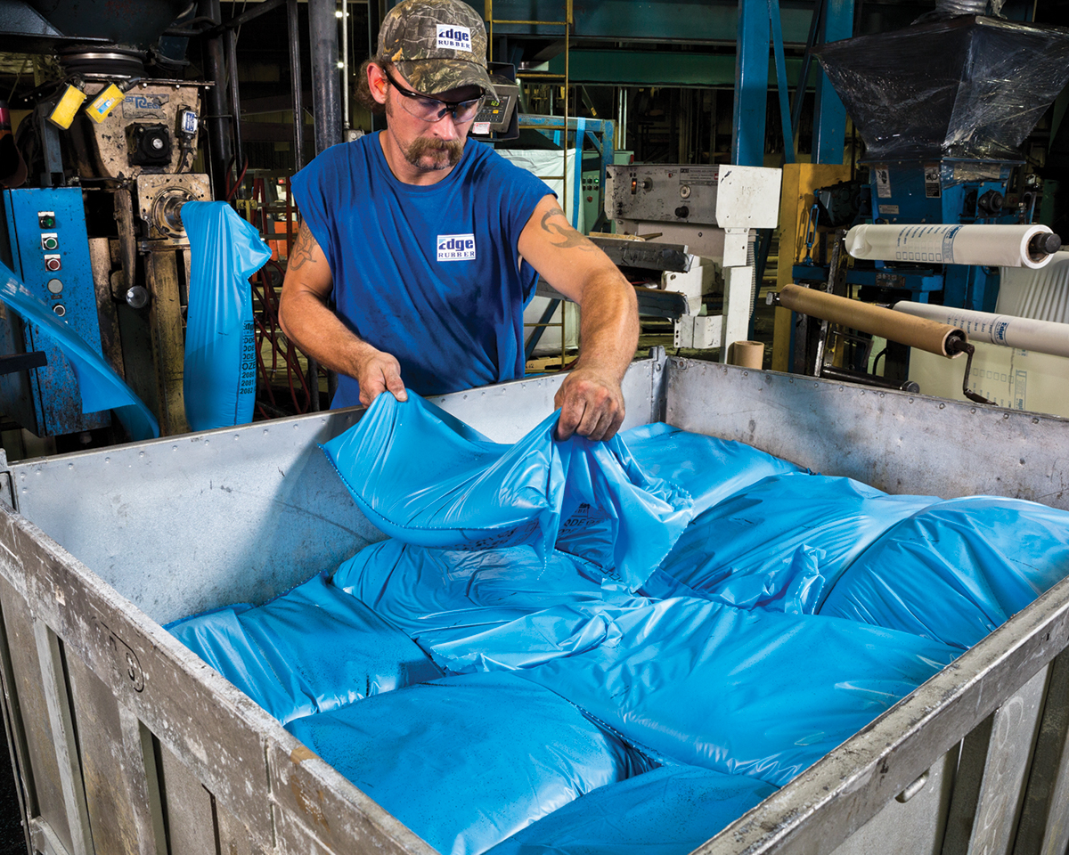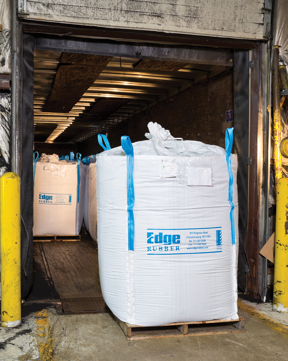 Most of Edge Rubber’s wet milled particles are packaged in pre-measured batch-inclusion bags that are placed directly into the customer’s molding process and then disintegrate by melting at a low temperature. The rest of the wet milled particles, along with the larger particles produced by the cracker mills, are shipped in various size bags to customers in the United States and internationally.