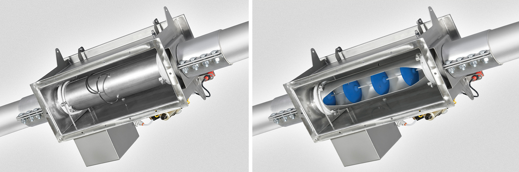 These conveyors gently transport almonds through smooth stainless steel tubing using low-friction polymer discs attached to a stainless steel cable. The system is powered by a drive wheel at one end of the circuit and maintained under tension by a wheel at the opposite end.