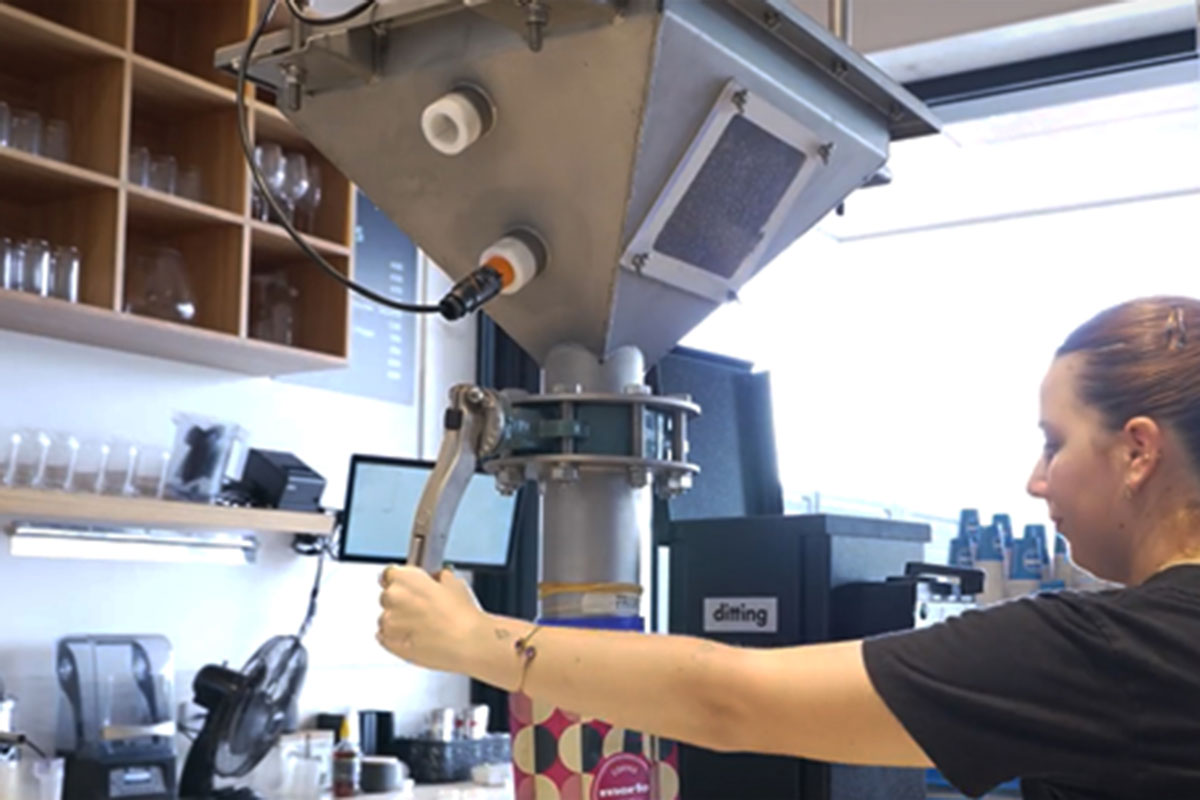 When a customer orders a cup of coffee, the operator opens the first pneumatically-actuated discharge valve in the line, allowing the beans to exit the circuit and drop down a rigid polymer tube into the grinder. If the order is for a takeout bag of whole beans, the first valve remains closed, and the beans travel through it to the second valve, which is opened. At this point, the beans slide down another tube into a hopper above the filling station.