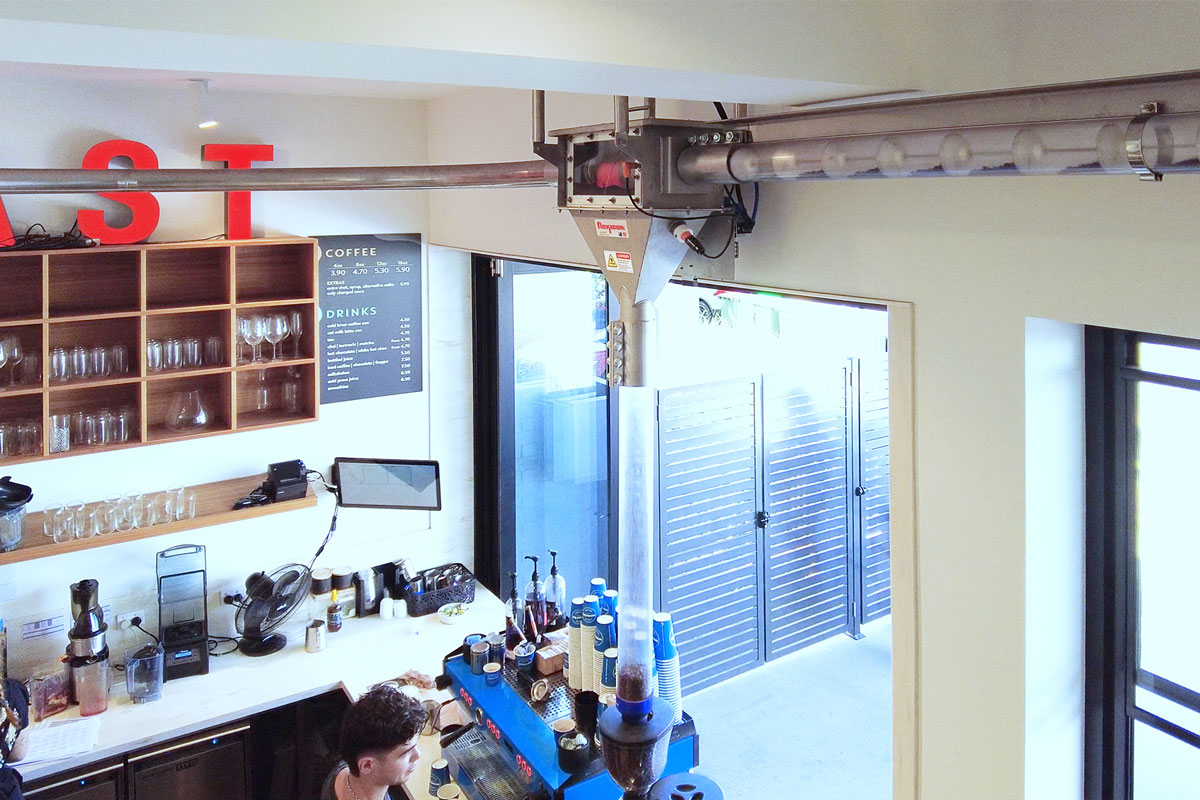 The gentle action of the conveyor minimises breakage of the fragile roasted beans and is completely enclosed to avoid any product contamination. The Merlo system features 100mm (4 inch) diameter tubing routed around the building in an oblong circuit, with four 90° degree bends around the outside corners and two 45° bends. A pair of inline discharge valves are mounted near the ceiling above the café area.