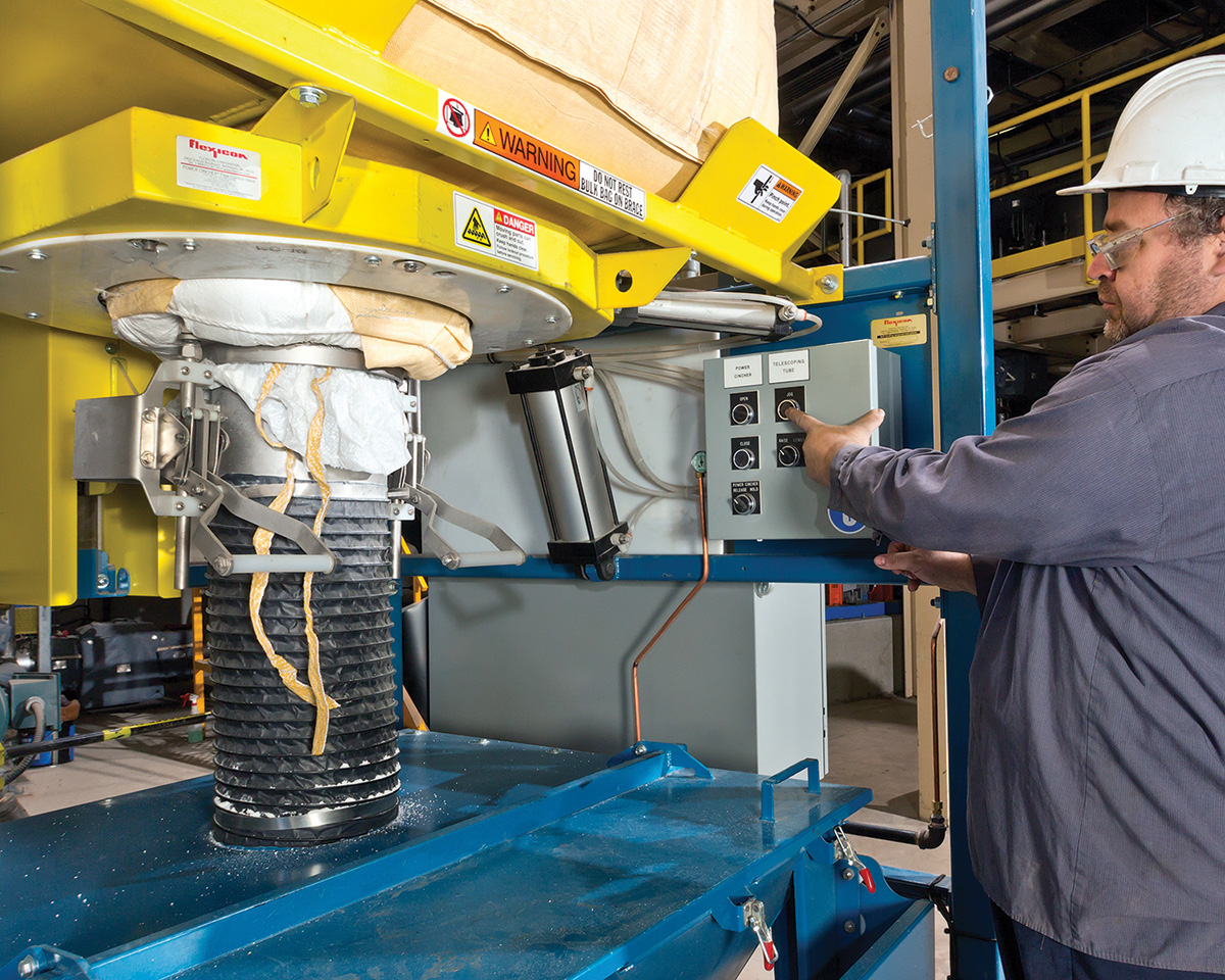 As the bulk bag contents flow into the hopper, displaced air and dust are drawn into a BAG-VAC® dust collector attached to the discharger frame. Reverse pulse air jets dislodge material collected on the filter for the particles to return to the material stream. Because the connection of the bag to the hopper is sealed, activating the dust collector causes the empty bag to collapse under vacuum, extracting air and residual dust. “When the process runs, there’s essentially no dust,” he says.