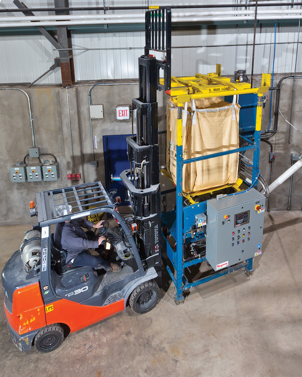With the new system, an operator attaches the bulk bag to a lifting frame and forklift-loads the frame and bag into receiving cradles atop the bulk bag discharger. With the bag secured over the 8 cu ft (226 l) capacity hopper, the operator pulls the bag spout through a POWER-CINCHER® flow control valve that cinches the bag spout to regulate flow, prevent product leakage, and permit dust-free retying of partially emptied bags.