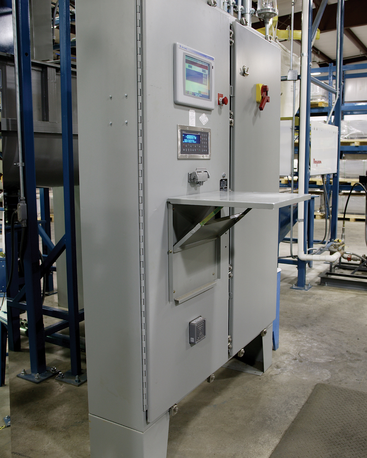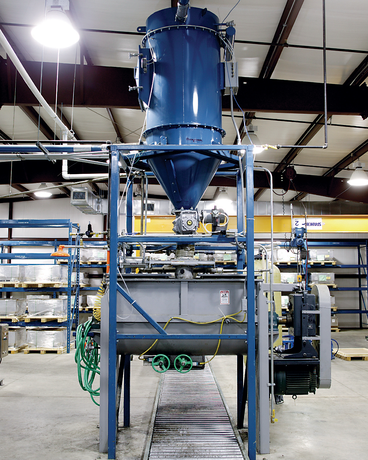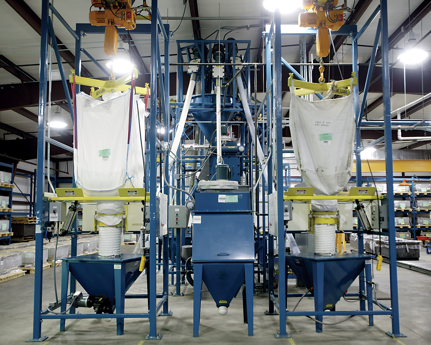 The fifth, minor ingredient is manually unloaded into a bag dump station with dust collection. The operator dumps several bags at a time into the hopper, filling it with about a week’s worth of the material.