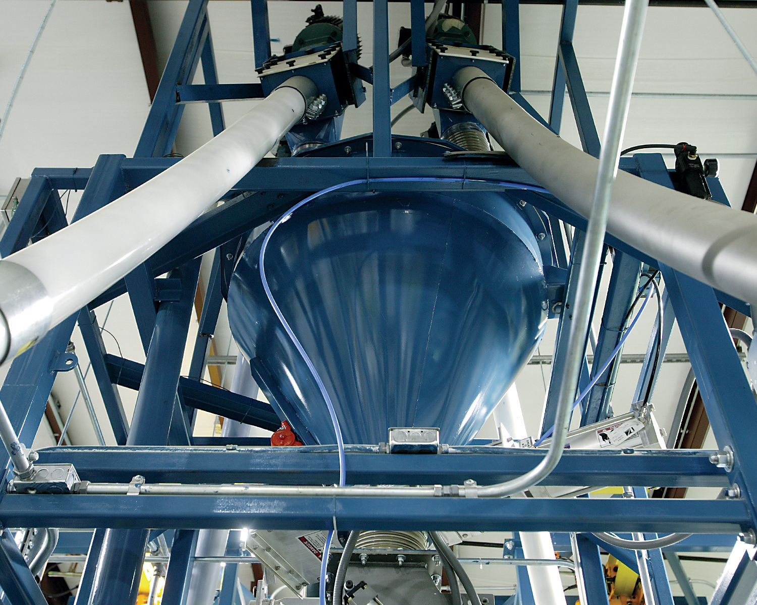 Bulk bags are unloaded with cantilevered I-beam bag unloaders equipped with electric hoists and trolleys, eliminating the need for a forklift. The bulk bag dischargers (Figure 2) are part of a sealed system that contains dust and promotes the flow and total evacuation of material.