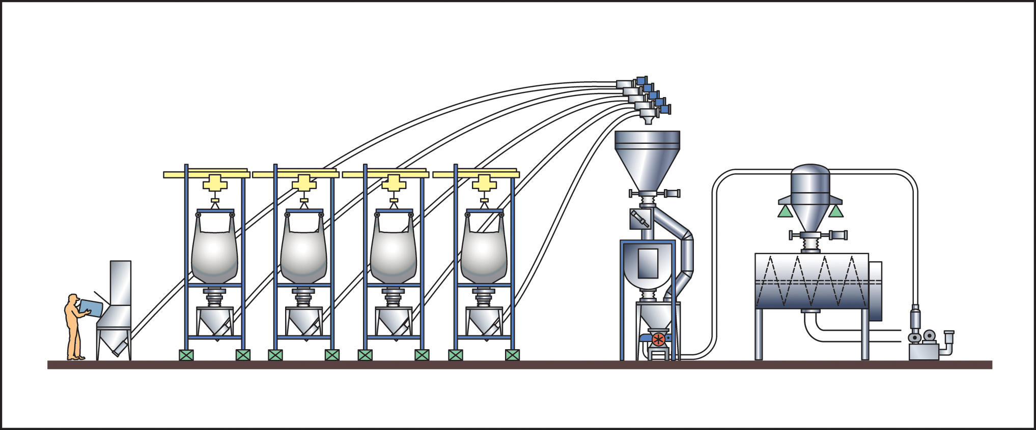 The process demanded bag unloading equipment and a weigh-batching system with powder conveying. Flexicon proposed a common gain-in-weight batching center using flexible screw conveyors to move the ingredients from the bag unloading hoppers, and pneumatic conveying to move the weighed ingredients to the proper destination. See figure 1 for an overall system schematic.