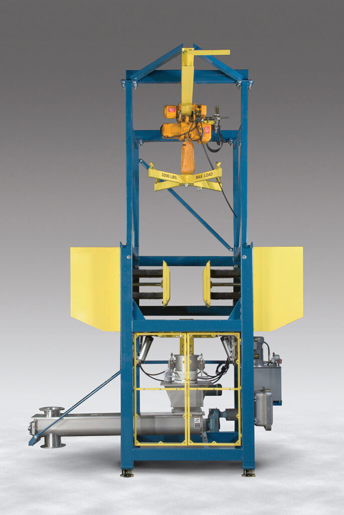 The entire unloading frame is mounted on load cells that transmit loss-of-weight data to a controller that starts and stops the auger conveyor, allowing programmable weigh batching directly from bulk bags.