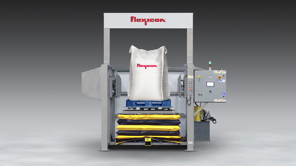 This BLOCK-BUSTER® Bulk Bag Conditioner from Flexicon Corporation features a laser safety curtain that automatically stops the system’s hydraulic rams, scissor lift and turntable if the laser beam is obstructed, eliminating the need for safety-hinged doors and interlock switches for operator safety.