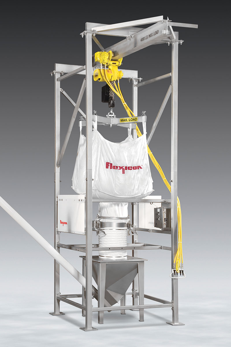 Flexicon also manufactures BFF-Series dischargers equipped with top-mounted receiving cups and a removable bag-lifting frame for forklift loading of bulk bags, as well as BFH half-frame models that rely on a forklift or overhead hoist to suspend the bag during discharge.