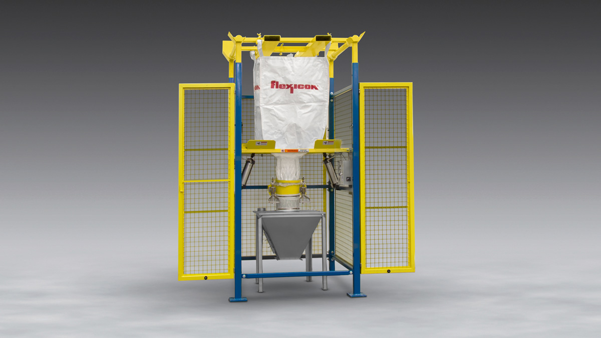 This BULK-OUT® Model BFF Bulk Bag Discharger features a steel safety cage to prevent contact with moving parts during operation and automated unloading of bulk bags. The enclosure features externally-mounted controls and full height doors with an Intrinsically Safe Relay (ISR) that halts operation when the door is open.