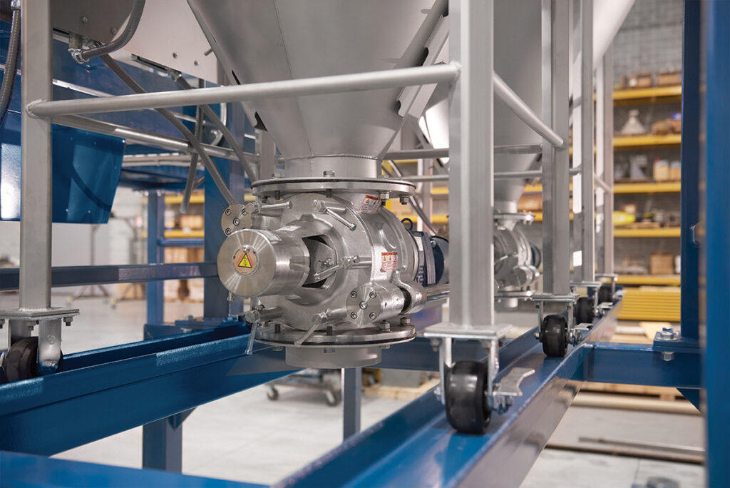 Hoppers discharge through stainless steel rotary valves equipped with support rails that allow the rotor assembly to separate from the valve body without tools for rapid for sanitizing.