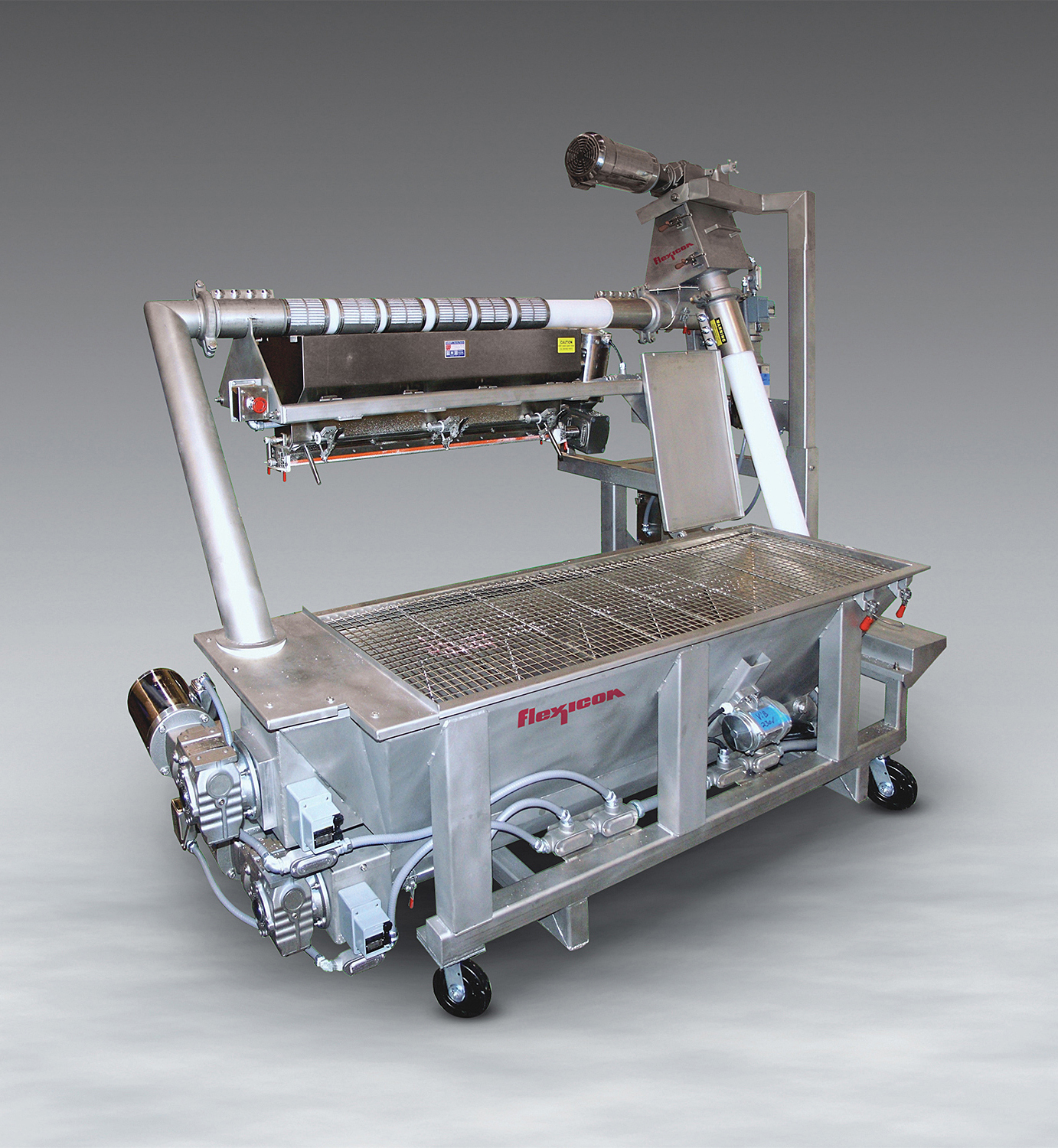 This Recirculating Spreader-Feeder from Flexicon evenly distributes powder and bulk coatings onto food products as they pass between the unit’s longitudinal discharge hopper and its lower collection hopper.