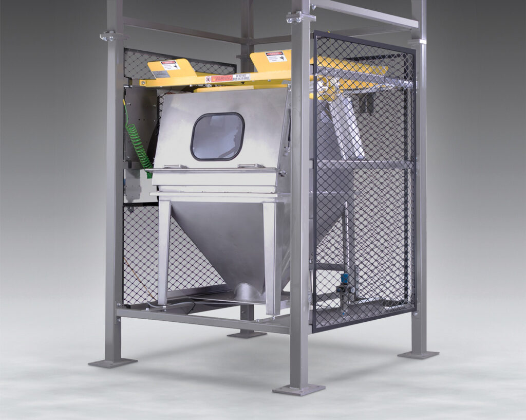 The six-sided enclosure seats against the rim of a hopper or flange of downstream equipment, and is equipped with an exhaust port for dust collection and a hinged door with inspection window.