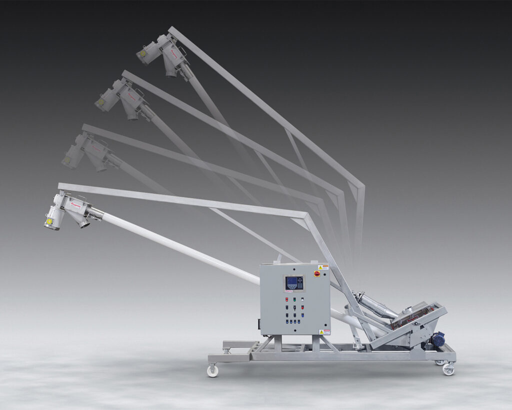 This Sanitary Tilt-Down Flexible Screw Conveyor (also known as a helix conveyor, screw conveyor, spiral conveyor or auger conveyor) on a caster-mounted frame can be maneuvered through narrow aisles and around corners. With the hopper, support boom and conveyor assembly tilted down, the unit fits through standard doorways and orients the conveyor tube horizontally, allowing the flexible screw to be removed easily for thorough cleaning and inspection.