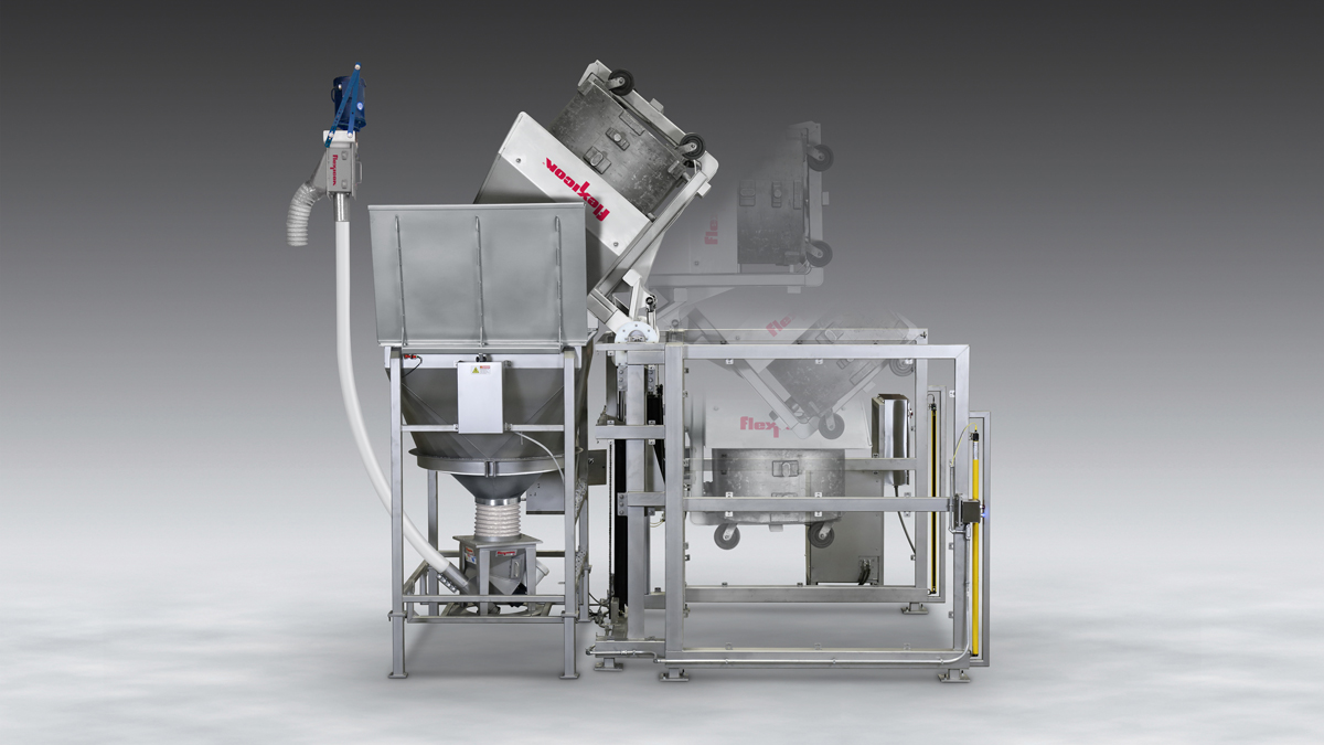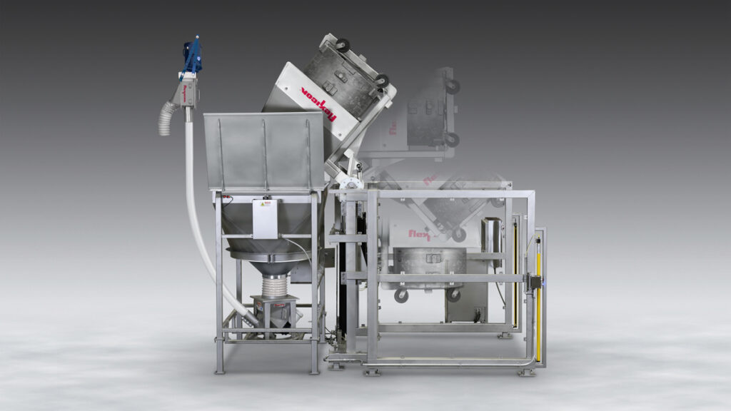 This open-chute High-Lift Bin Dumper from Flexicon hydraulically raises and dumps mobile bins into a hopper that feeds an integral flexible screw conveyor operating under loss-of-weight control.