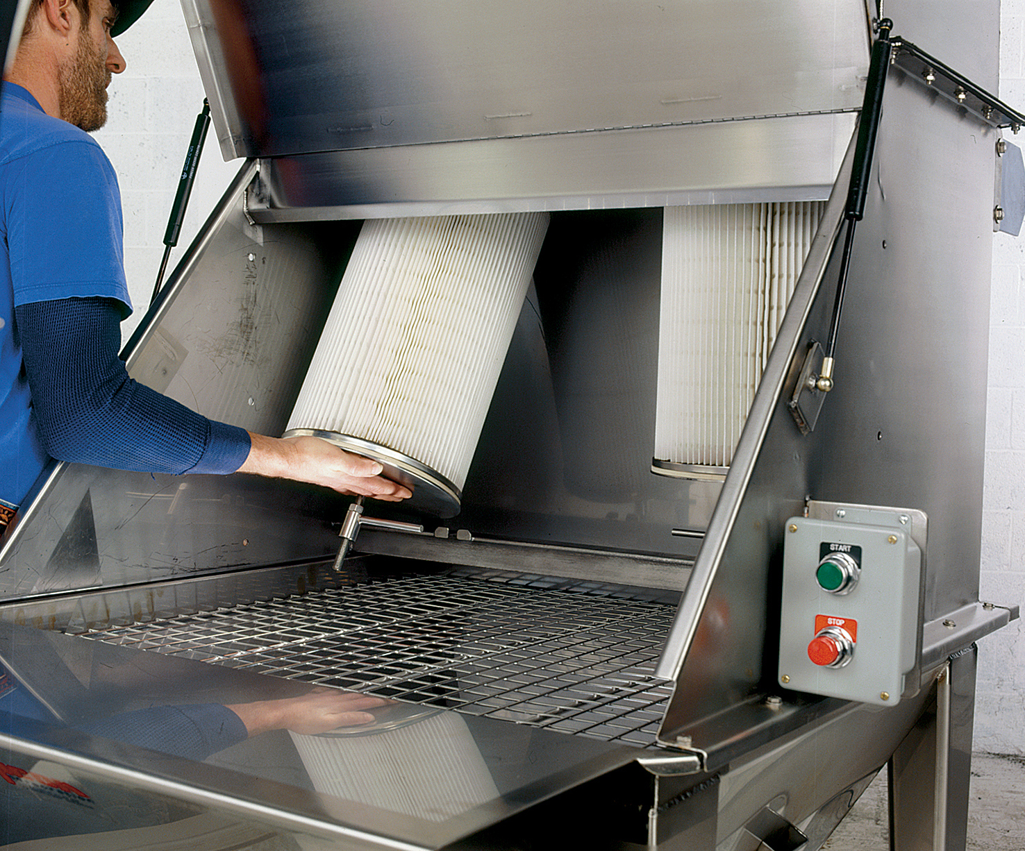 It features a high velocity vacuum fan that draws airborne dust from the operator’s atmosphere onto two cartridge filters. Automatic reverse-pulse filter cleaning allows continuous, efficient operation; timer activated solenoid valves release short blasts of compressed plant air inside cartridge filters causing dust build-up on the outer filter surfaces to fall into the hopper.