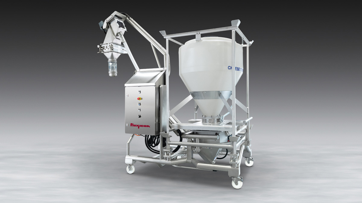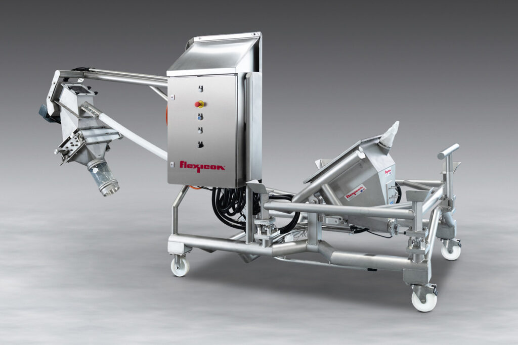 This Flexicon Mobile Sanitary IBC Unloading and Conveying System transfers contamination-sensitive bulk solid materials from Intermediate Bulk Containers (IBCs) to downstream processes, dust-free.