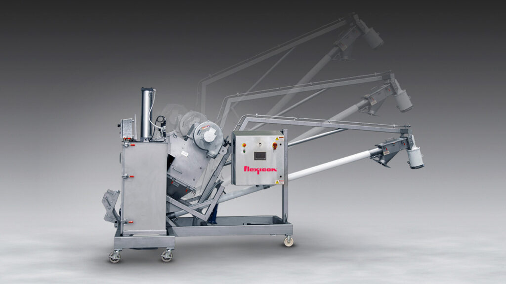 This sanitary mobile Tilt-Down Flexible Screw Conveyor with Integral Bag Dump Station and Compactor allows the transfer of material manually dumped from handheld bags into elevated process equipment, and the disposal of empty bags, dust-free.