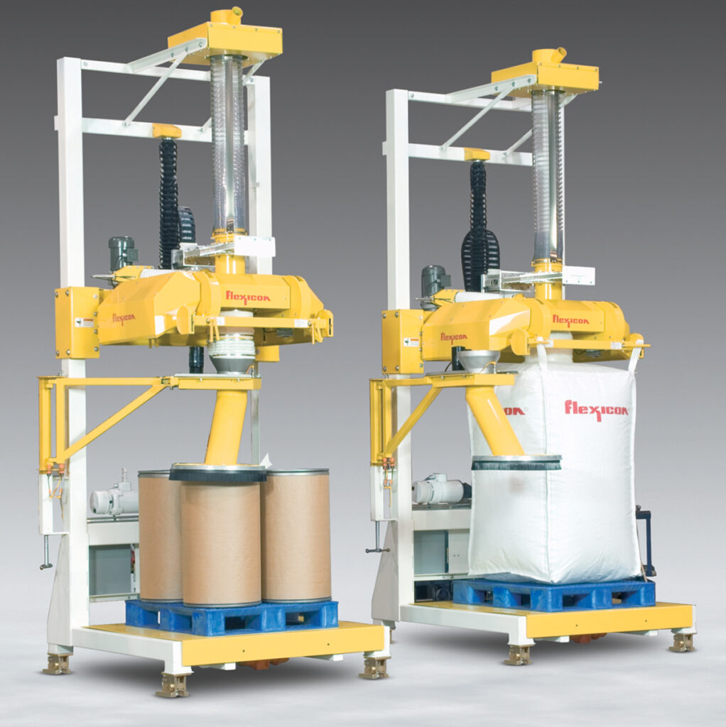 Flexicon’s combination bulk bag/drum filler features a fill head that pivots down for connecting empty bags at floor level, and a swing-arm-mounted chute for filling of drums.