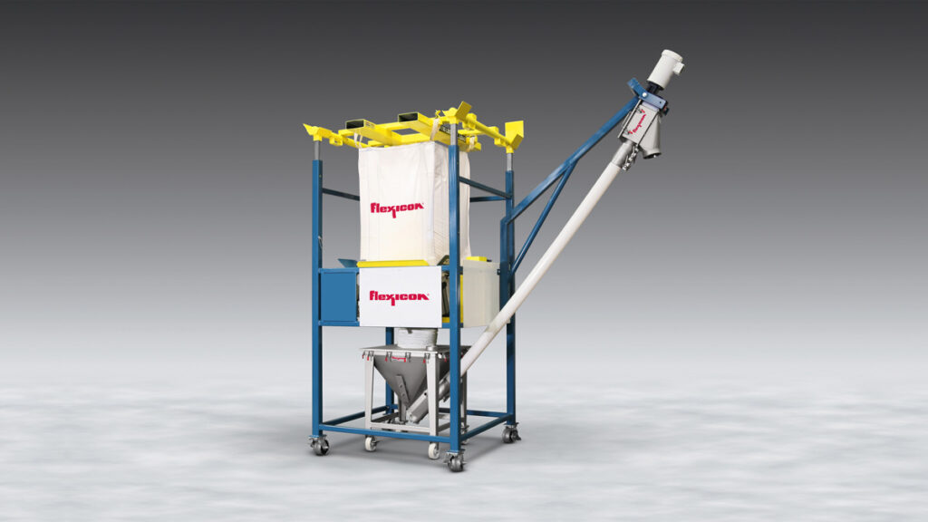 Flexicon Mobile Bulk Bag Discharger with Mobile Flexible Screw Conveyor allows dust-free discharging of bulk solid materials and conveying to downstream process equipment or storage vessels throughout the plant.