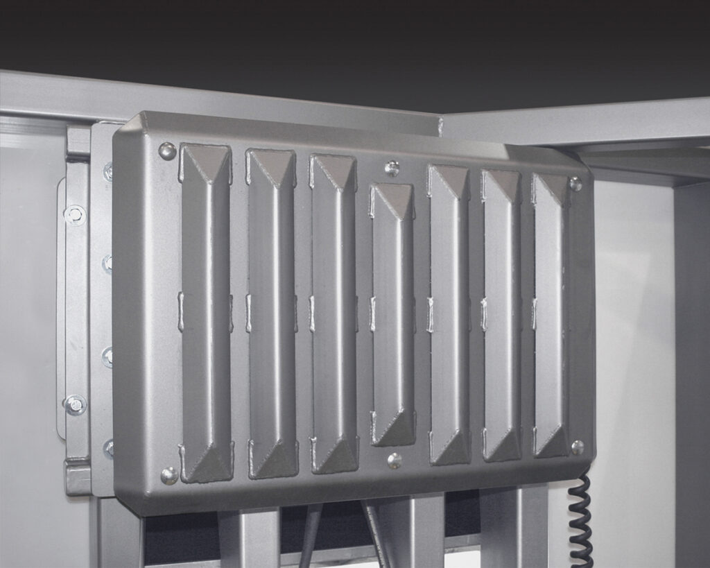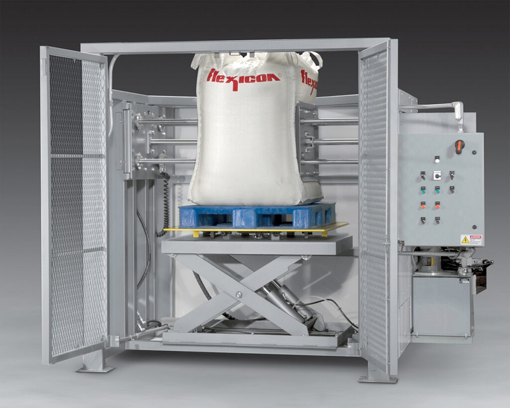 The unit measures 87″ (2210 mm) H X 133″ (3378 mm) W X 78″ (1981 mm) D, and accommodates bulk bags of all popular sizes. It is fully enclosed on all four sides for operator safety and includes full-height doors that are interlocked to disallow operation of the system when the doors are open.