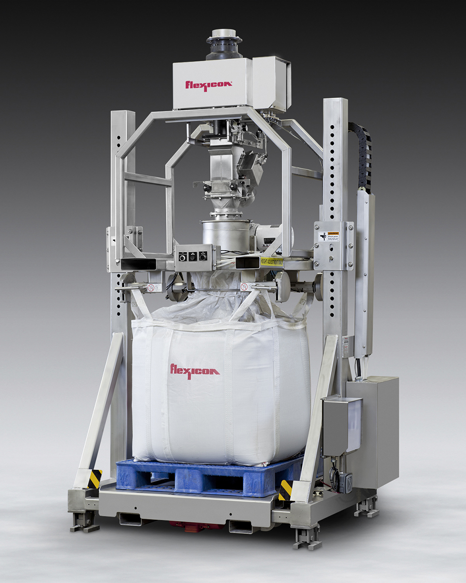 The filler also incorporates: fill head height adjustment to accept all popular bag sizes; an inflatable cuff forming a high-integrity seal to the bag inlet spout; a blower to remove bag creases prior to filling; load cells for filling by weight; a vent port for dust-free air displacement during filling; pneumatically retractable bag hooks; and an automated vibratory deaeration/densification system to maximize capacity and stabilize the bag for storage and shipment.