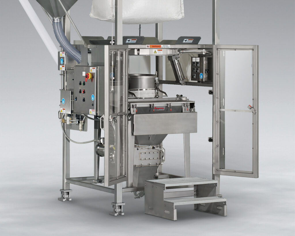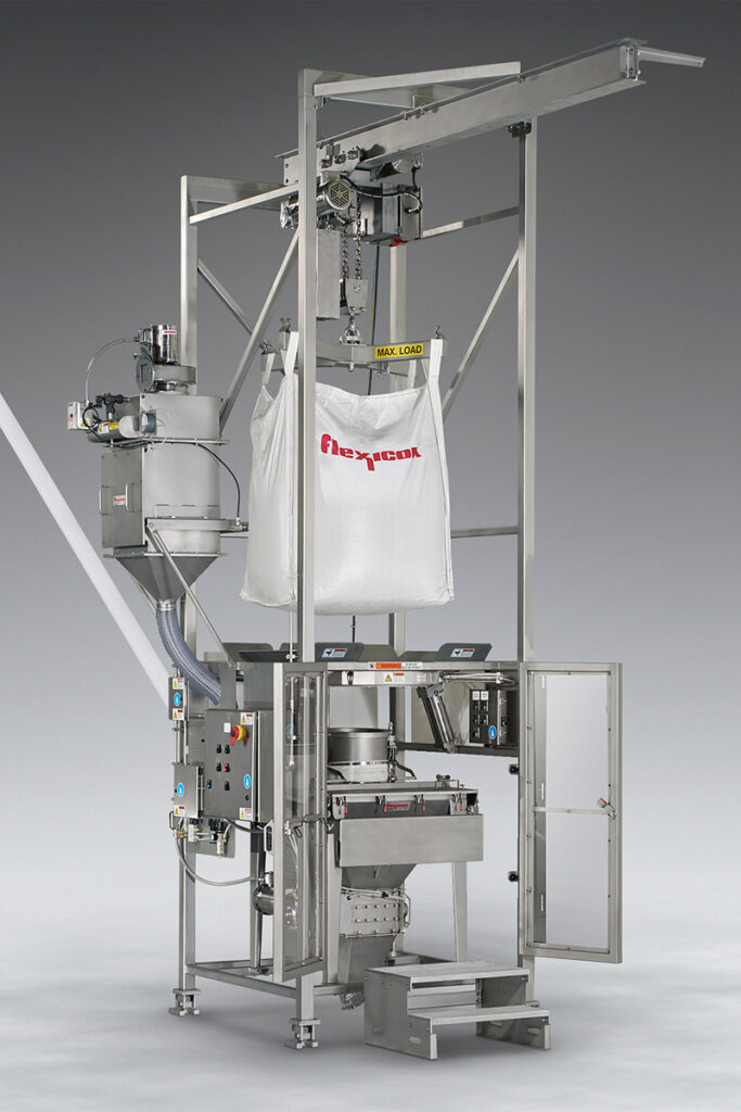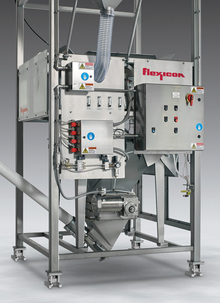 This BULK-OUT® Bulk Bag Weigh Batch Unloading System with Manual Dumping Station and Flexible Screw Conveyor automatically conveys weighed batches of contamination-sensitive materials to downstream processes and allows rapid sanitizing.