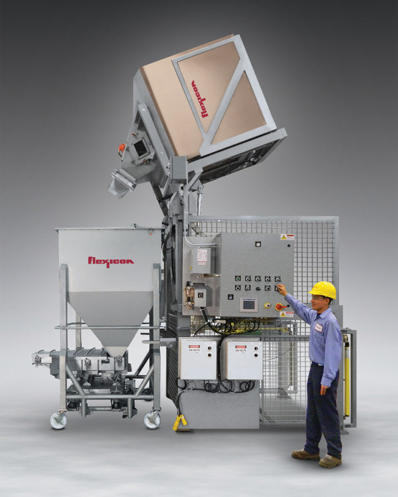 Boxes measuring 36 to 48 in. (915 to 1220 mm) on a side and 39 to 44 in. (990 to 1117 mm) in height are loaded at floor level and raised hydraulically to seat against a discharge hood. The assembly is then hydraulically elevated and tipped, which mates the spout of the discharge hood to a gasketed receiving ring installed on the lid of the mobile bin.