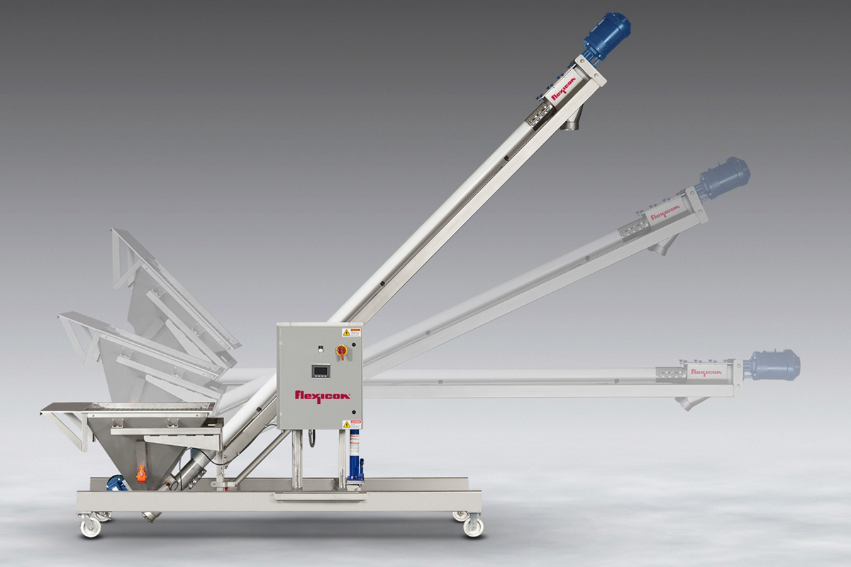 This mobile tilt-down flexible screw conveyor fits restrictive processing situations and offers a low center of gravity, and full accessibility from standing height.