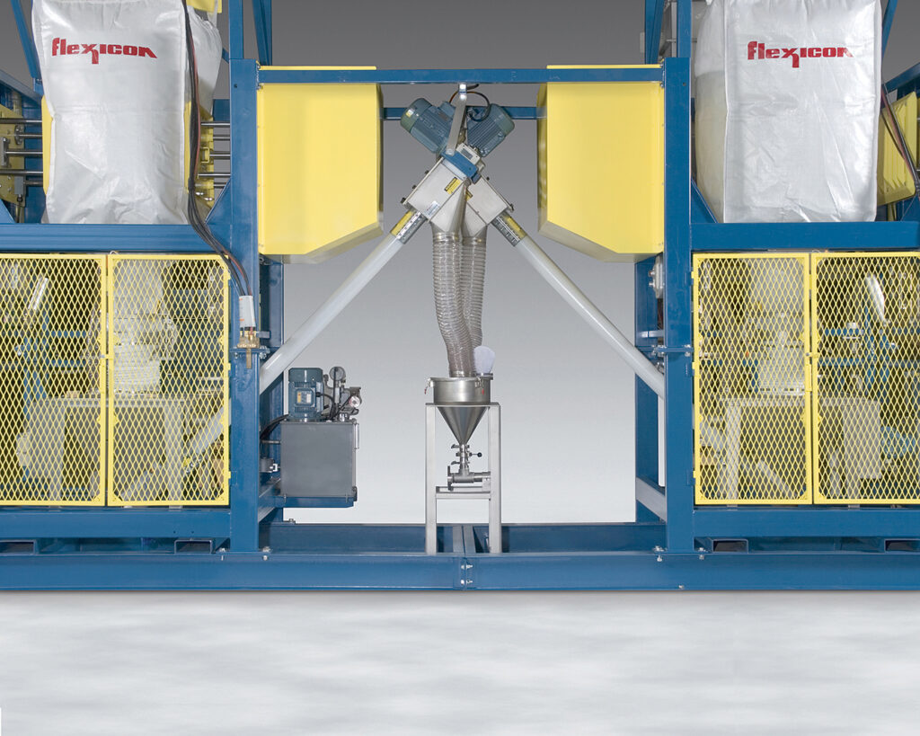 Bulk Bag Weigh Batch Eductor System features dual bulk bag unloaders, each with integral bulk bag conditioners and flexible screw conveyors feeding a central eductor that feeds solid material into a liquid stream.