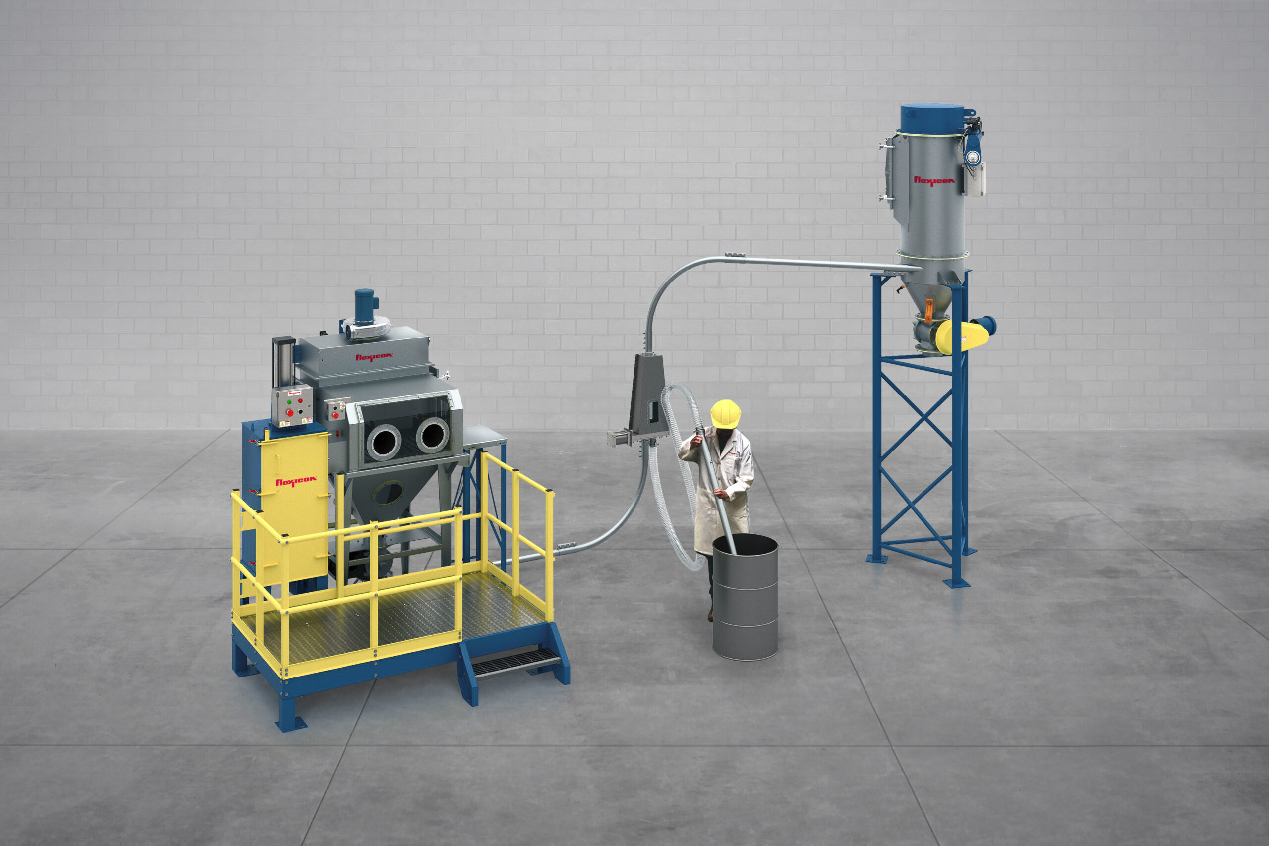 The bag dumping station is mounted on an access platform constructed of carbon steel. The stainless-steel hopper is equipped with a dust hood that features a glove box. Using the gloves, the operator pulls bags of material from an adjacent table through an opening in the hood’s sidewall and onto a grate. Each bag is opened and emptied without any material contacting the operator’s skin. The emptied bags are then passed through the opposite side wall opening into a bag compactor, maintaining a clean workflow.