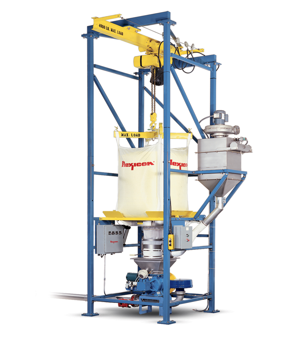 BFC Series dischargers are characterized by a cantilevered I-beam with electric hoist and trolley to raise and position bulk bags without the aid of a forklift. Also offered are BFF Series dischargers equipped with top-mounted receiving cups and removable bag-lifting frames for forklift loading of bulk bags at low cost.
