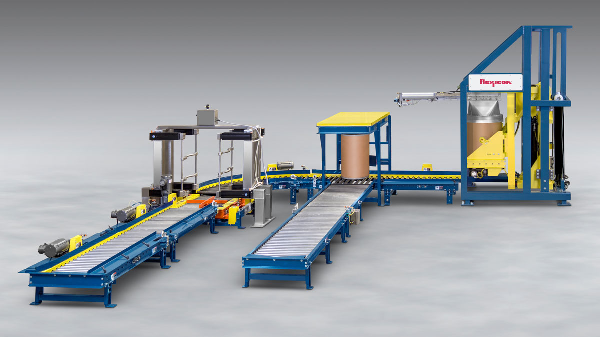 A powered roller conveyor moves each full drum into a conditioning station where hydraulic rams press and release it on opposite sides. A turntable then rotates the drum in user-selected increments for