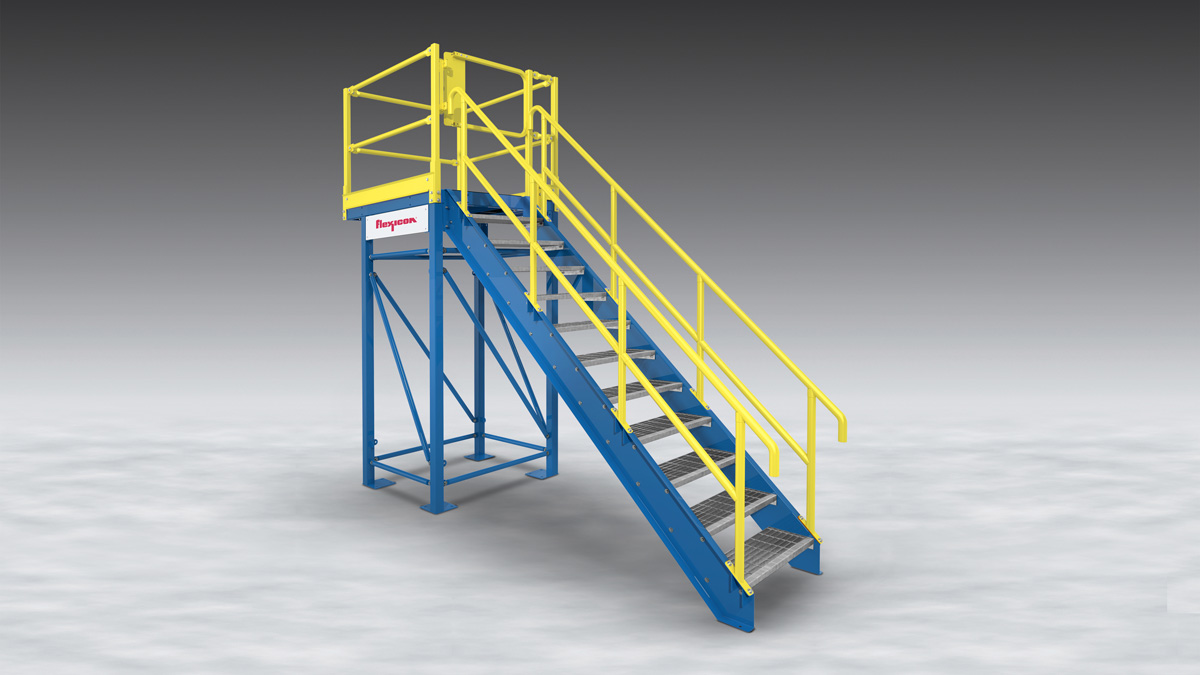The modular system includes braced frames which can be bolted to the floor, 48 in. square (1220 mm square) deck sections, and stairways with elevations up to 96 in. (2.4 m).