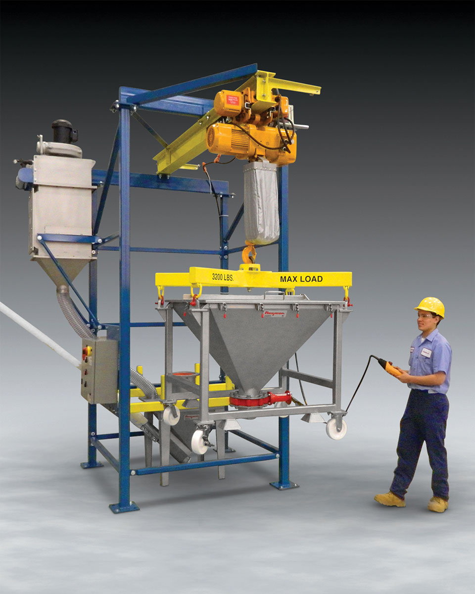 Lifting arms fitted with four eye hooks connect to the mobile IBC frame, which is equipped with four inverted cradle cups that mate with corresponding posts on the discharger frame for precise positioning of the IBC outlet.