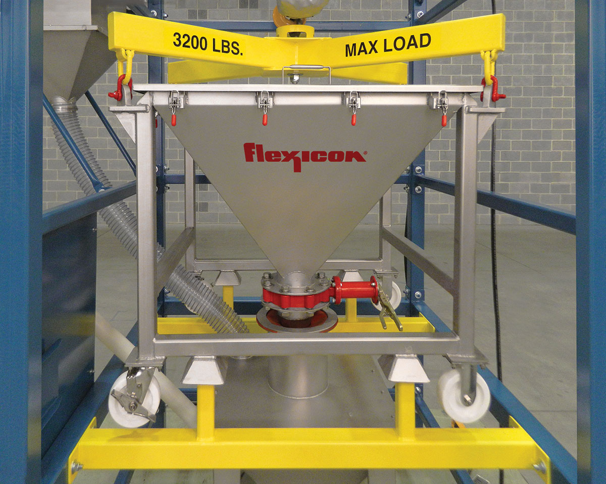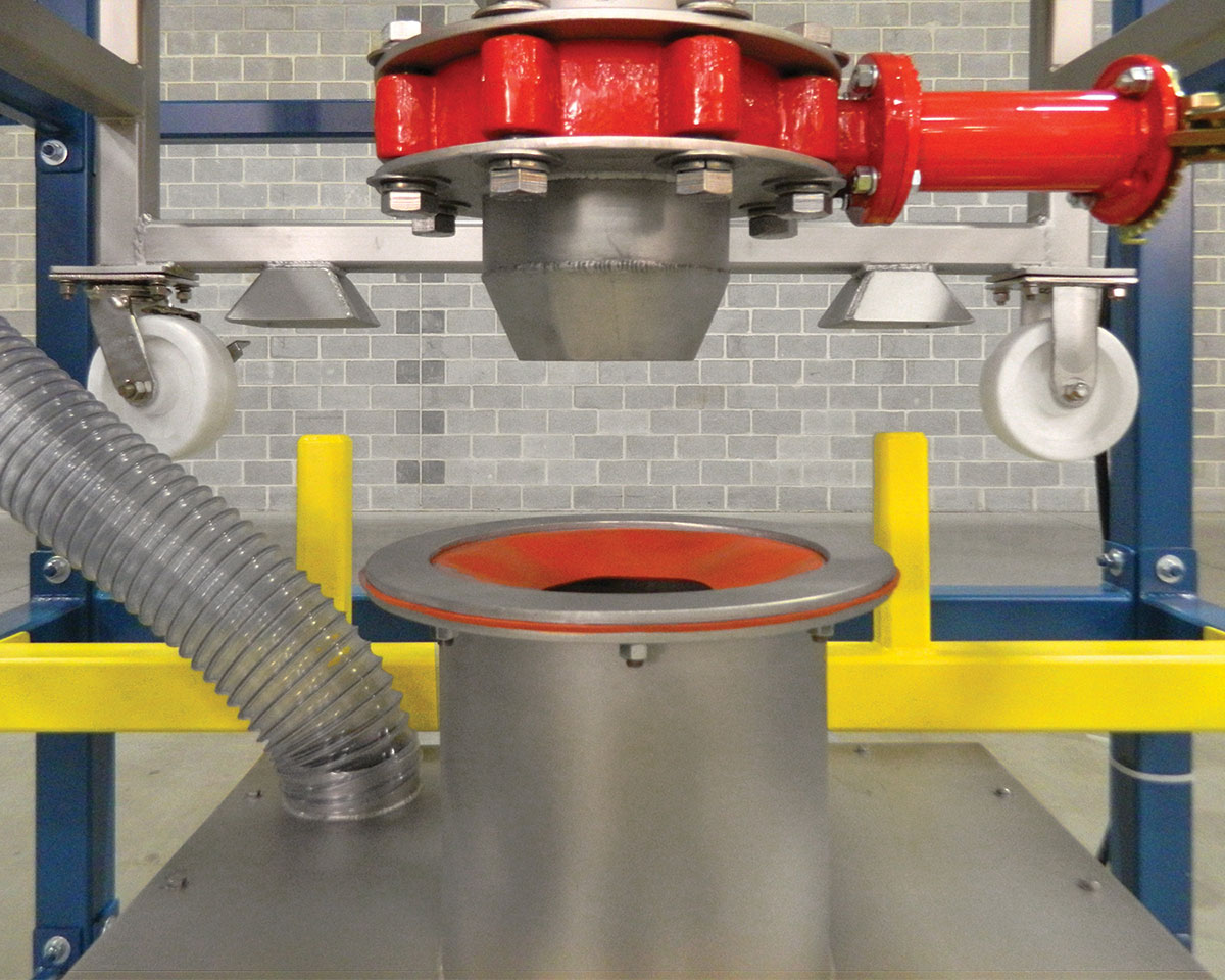 When lowered into position, the tapered outlet of the IBC’s butterfly discharge valve mates with a gasketed receiving ring on the lid of a surge hopper, allowing opening of the valve and discharging of material with no dusting.