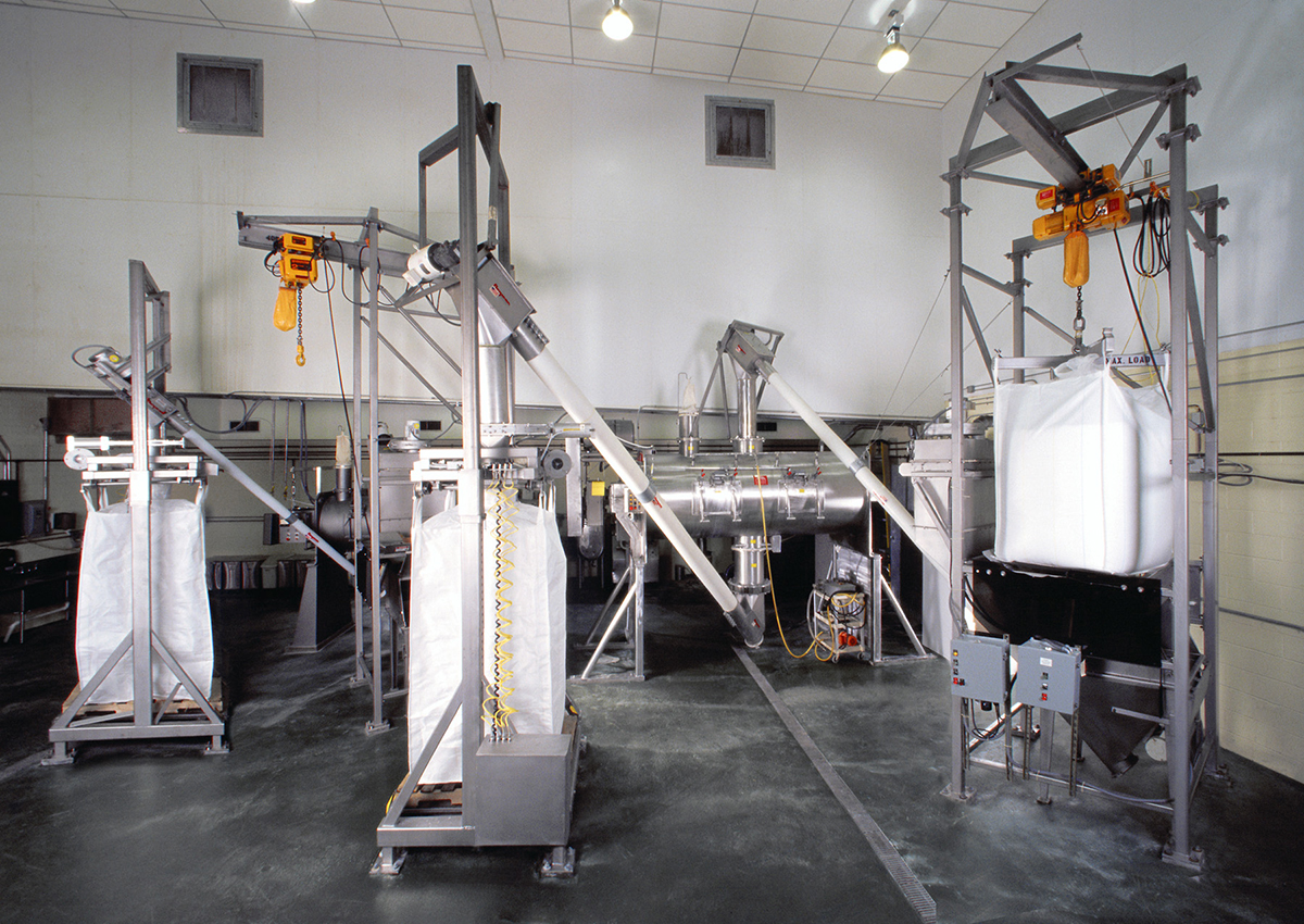 The company boosted production with two bulk transfer systems comprised of three bulk bag dischargers, two bulk bag fillers and five flexible screw conveyors; all manufactured by Flexicon, one 2500-lb (1125 kg) and one 500-lb (225 kg) capacity blender, and two fill-by-weight packaging machines.