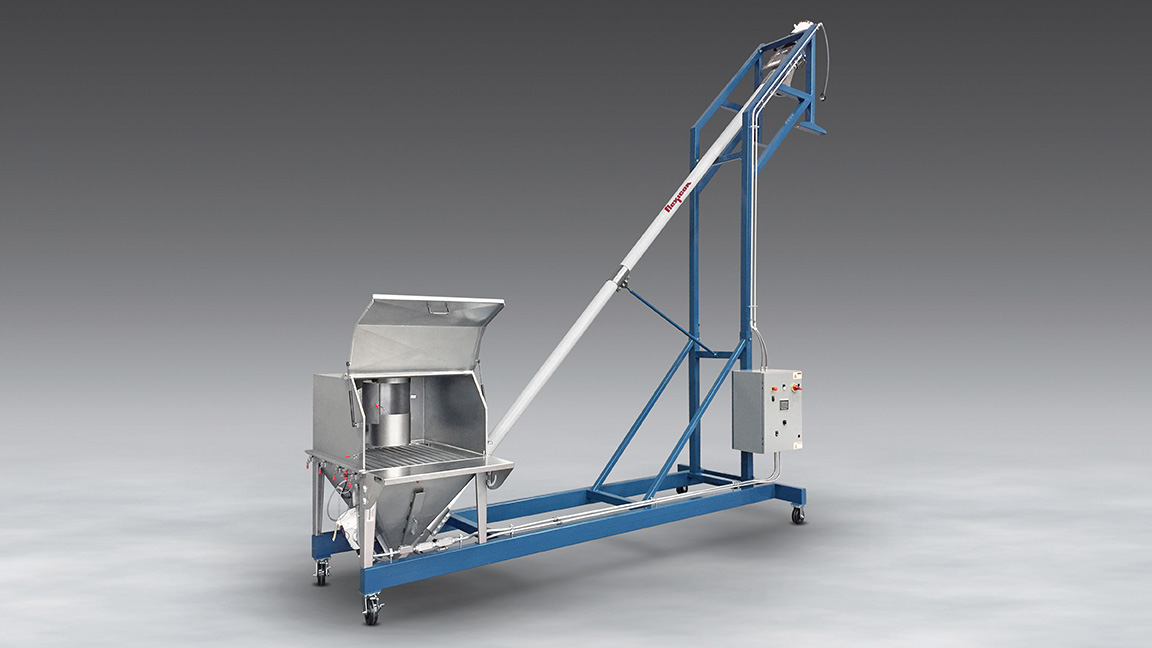 All material contact surfaces are of stainless steel finished to sanitary or industrial standards with the exception of the conveyor’s polymer outer tube. The mobile frame is constructed of carbon steel with a durable industrial coating, and is also available in stainless steel.