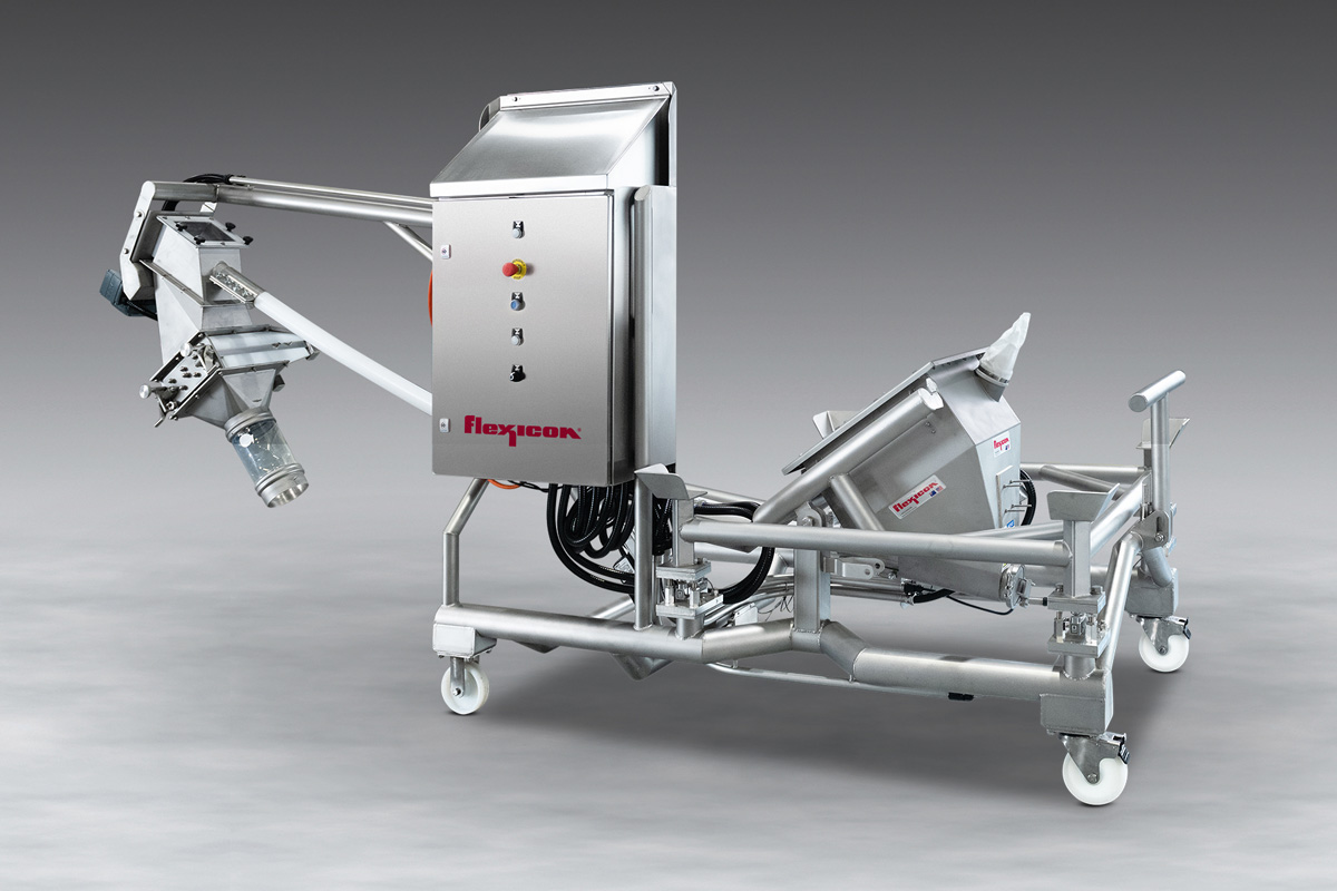Ready to plug in and run, the mobile unit can serve multiple functions throughout the plant. It can be rolled to a cleaning station where a lower clean-out cap on the conveyor tube can be removed to flush the smooth interior surfaces with steam, water or cleaning solutions, or to fully remove the flexible screw for cleaning and inspection.
