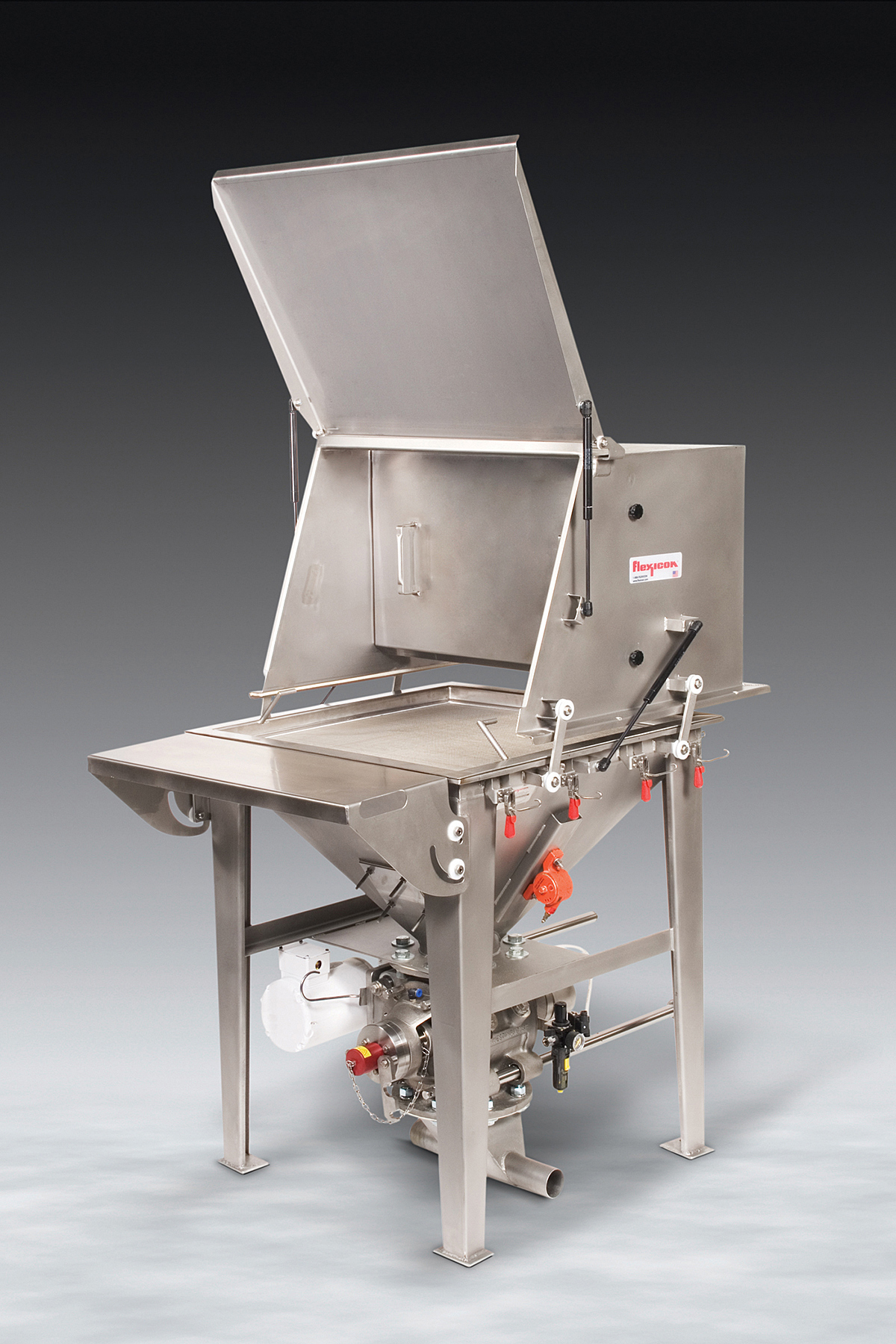 The all-stainless unit is also offered with an integral flexible screw conveyor, or with universal hopper discharge flange for connection to downstream process equipment, and is available mounted on frames with casters for in-plant mobility.