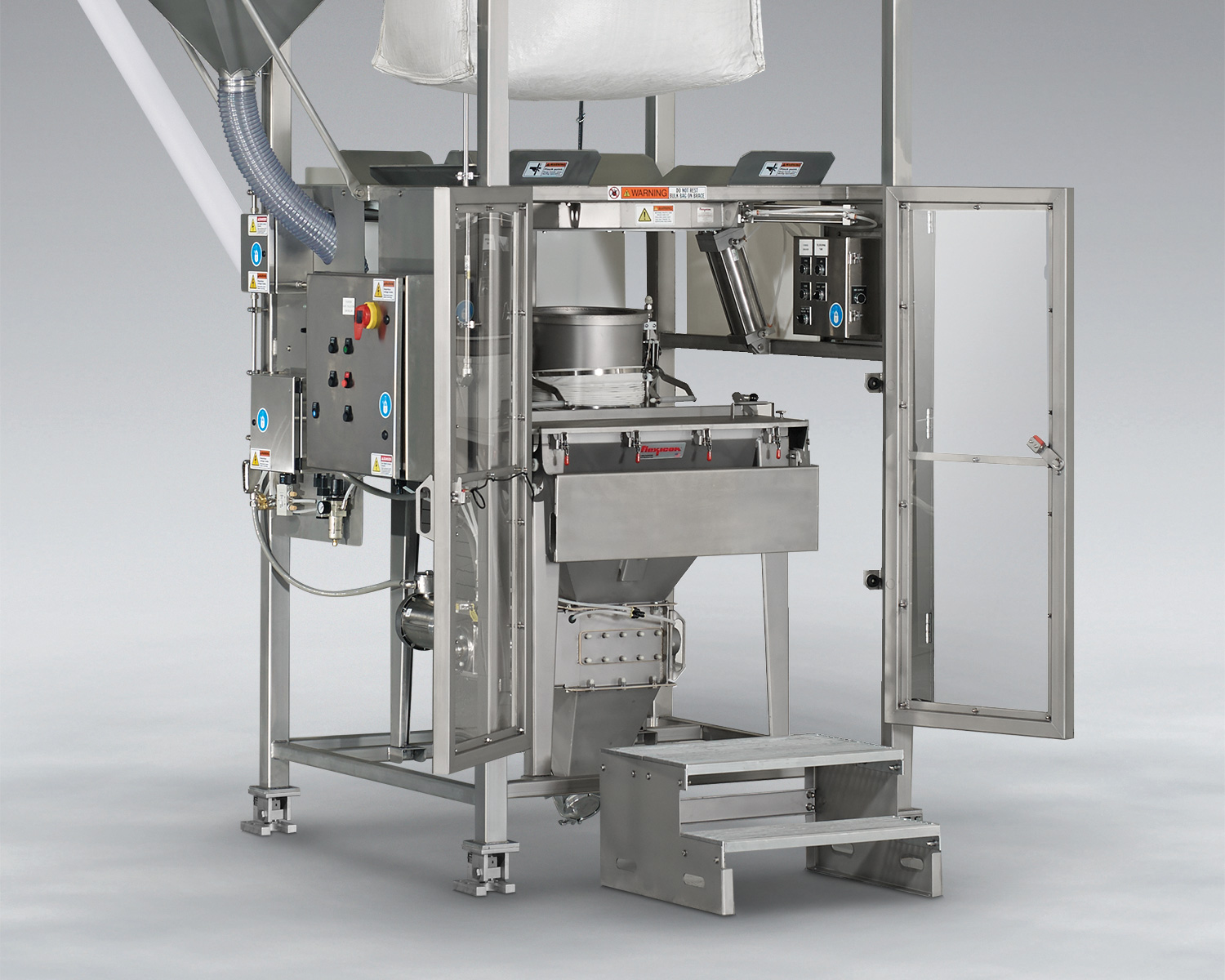 The hopper is vented to a BAG-VAC® dust collection system that draws airborne dust from manual dumping activities away from the operator when the hopper lid is open. When the hopper lid is closed during bulk bag discharging, the dust collection system additionally prevents displaced air and dust from entering the plant atmosphere, and collapses empty bags prior to tie-off, preventing dust generated when empty bags are flattened manually.
