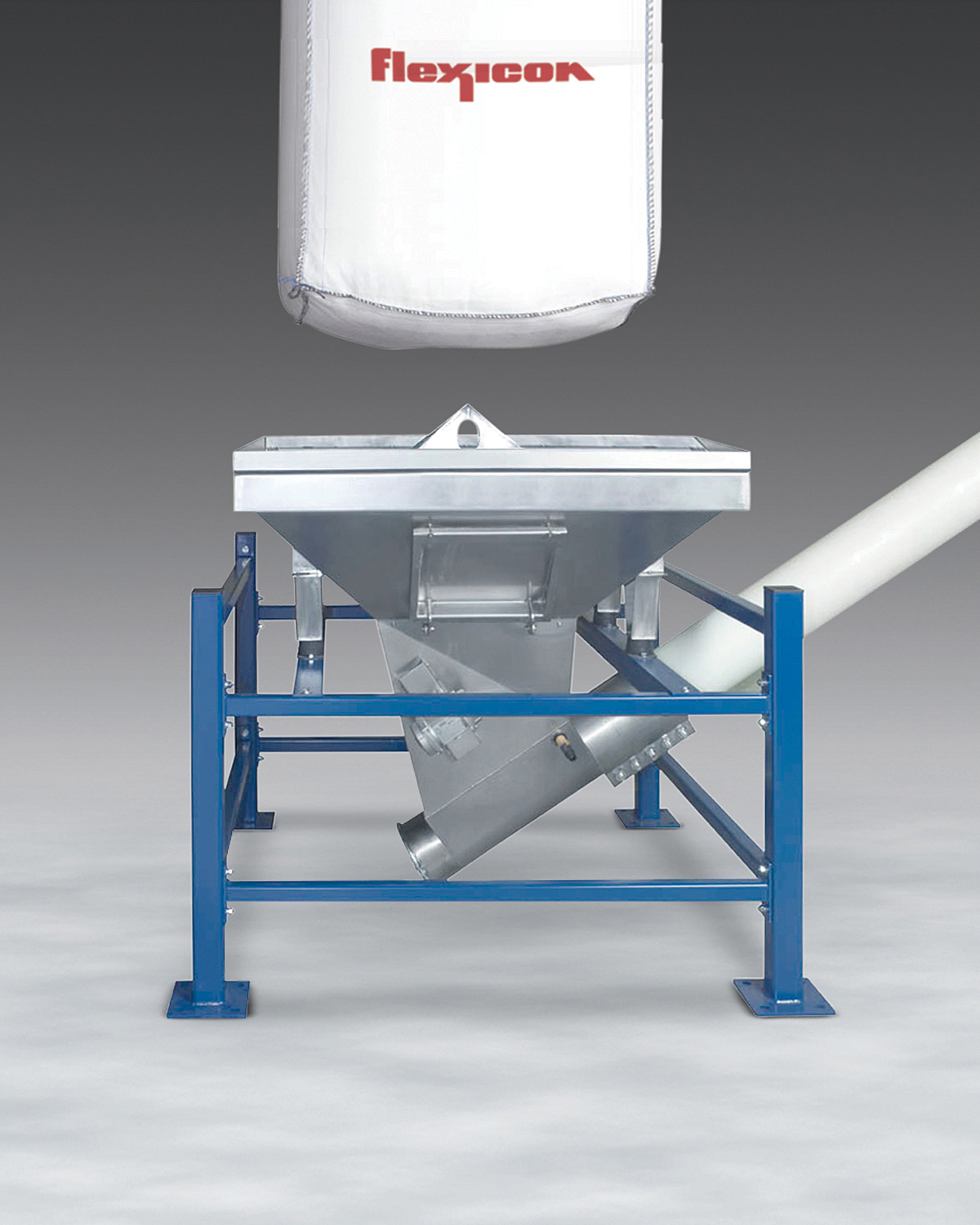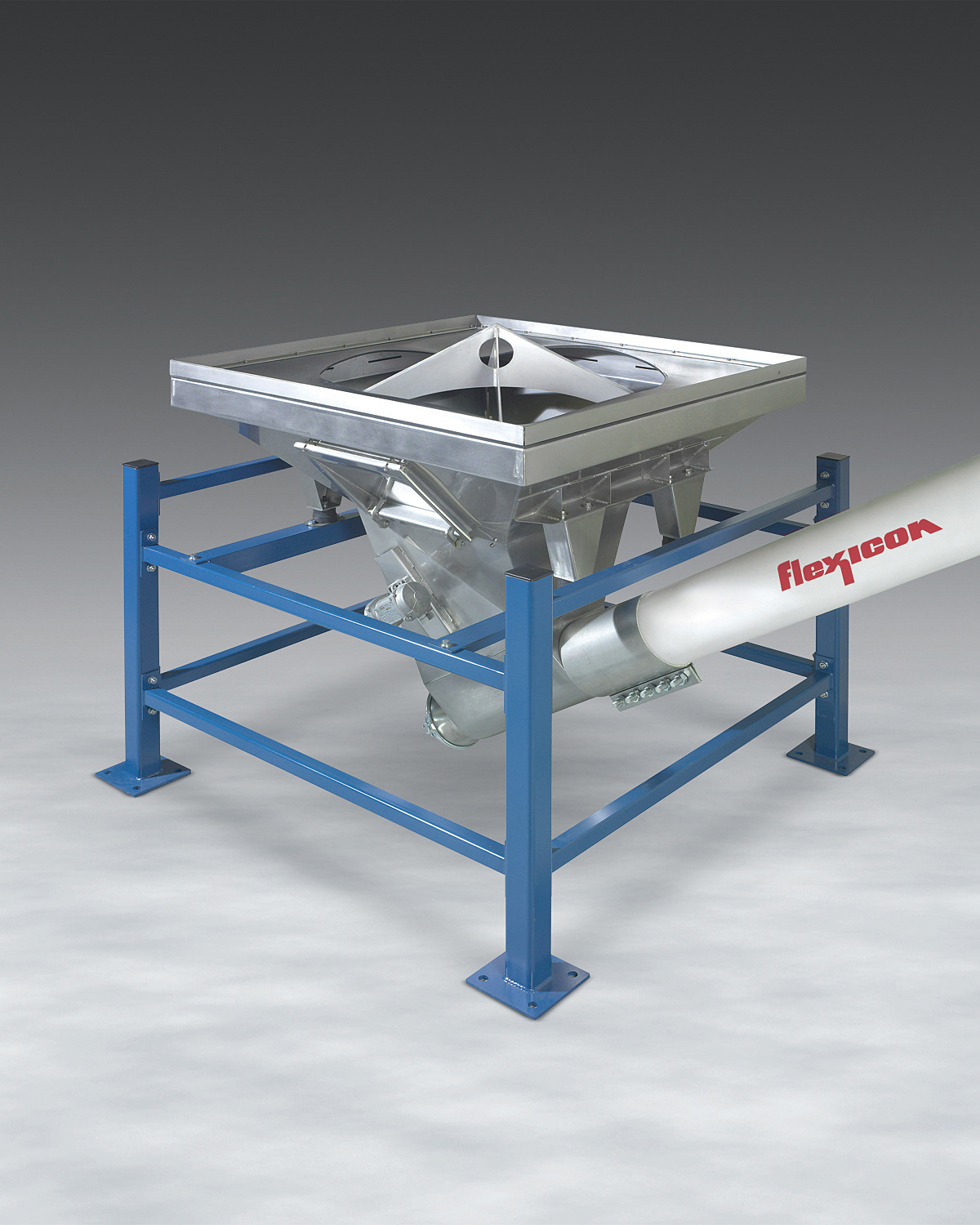 The unloader relies on the user’s forklift or plant hoist to lower single-use bulk bags onto a four-bladed bag piercing knife that cuts the bag bottom from seam-to-seam, promoting complete discharge without the use of flow promotion devices otherwise needed to move material through narrow bag spouts.