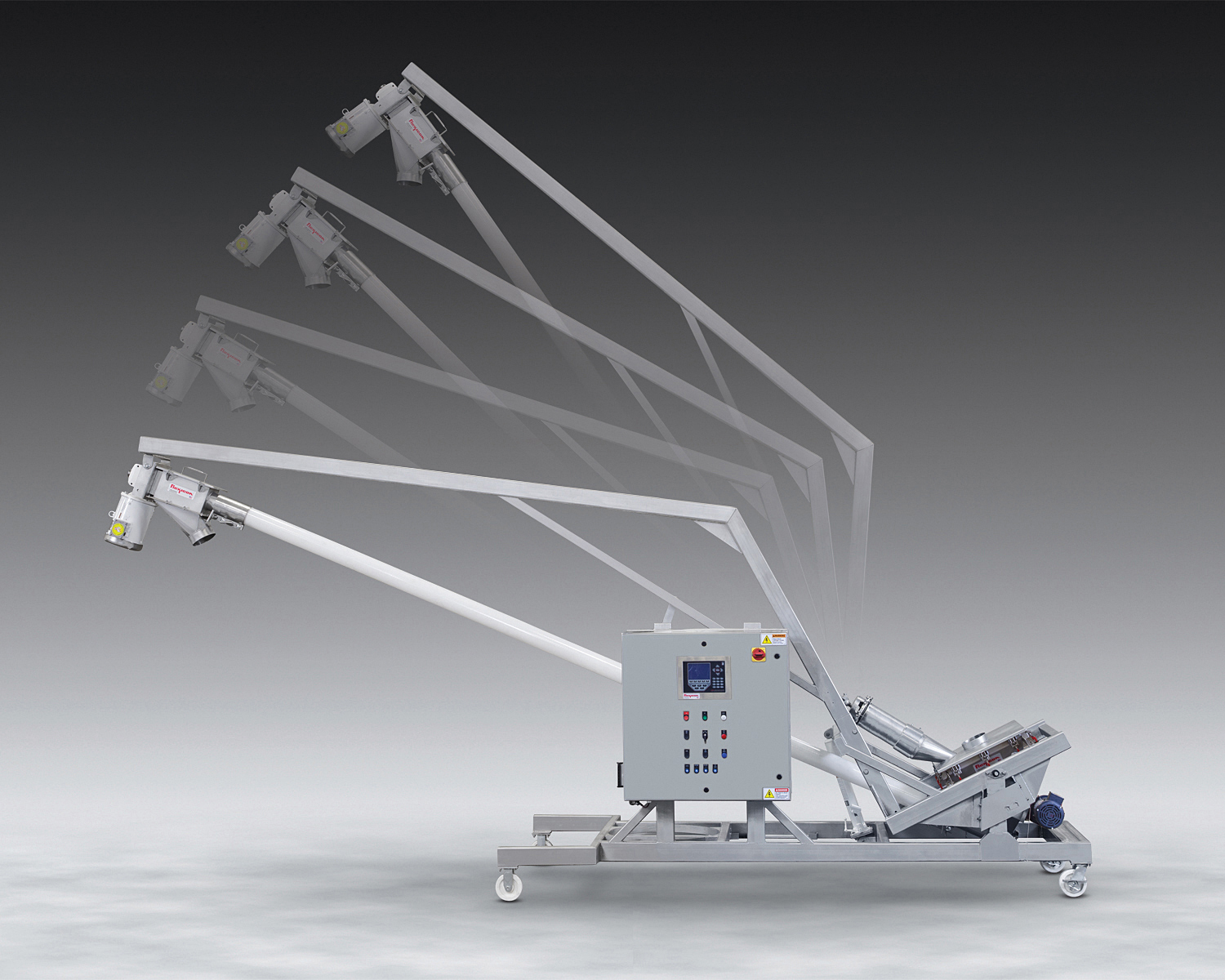 Tilt-Down Flexible Screw Conveyor Fits Tight Spots, Collects Dust, Sanitizes Easily
